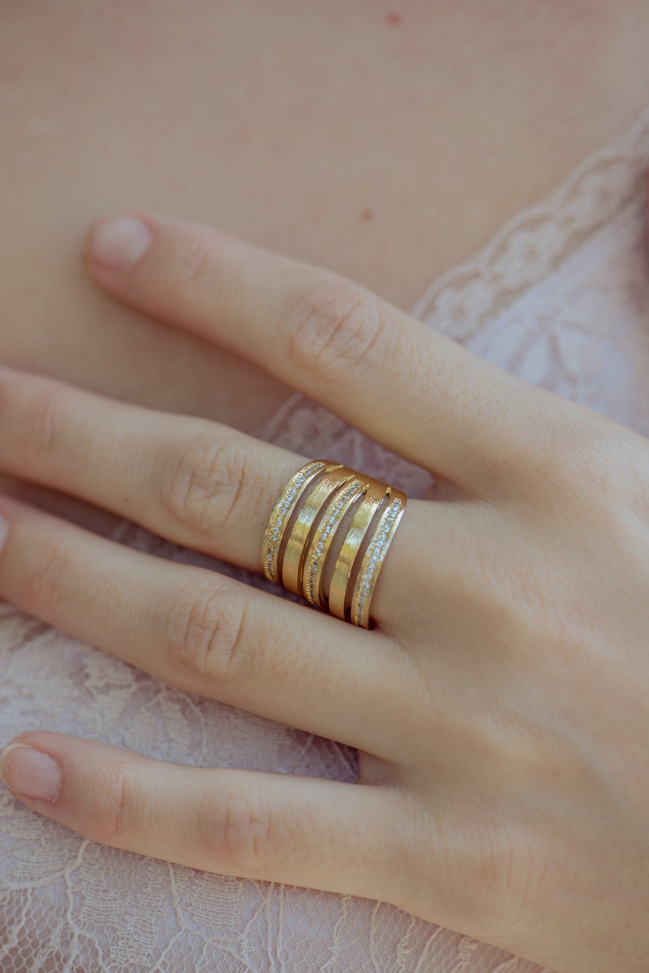 The 18k gold plated brushed ring with five bands and zirconias surrounding the ring sounds stunning and luxurious. Its handmade quality from Brazil adds a special touch to its sophisticated design! It pairs with the Zion Hoop Earrings.