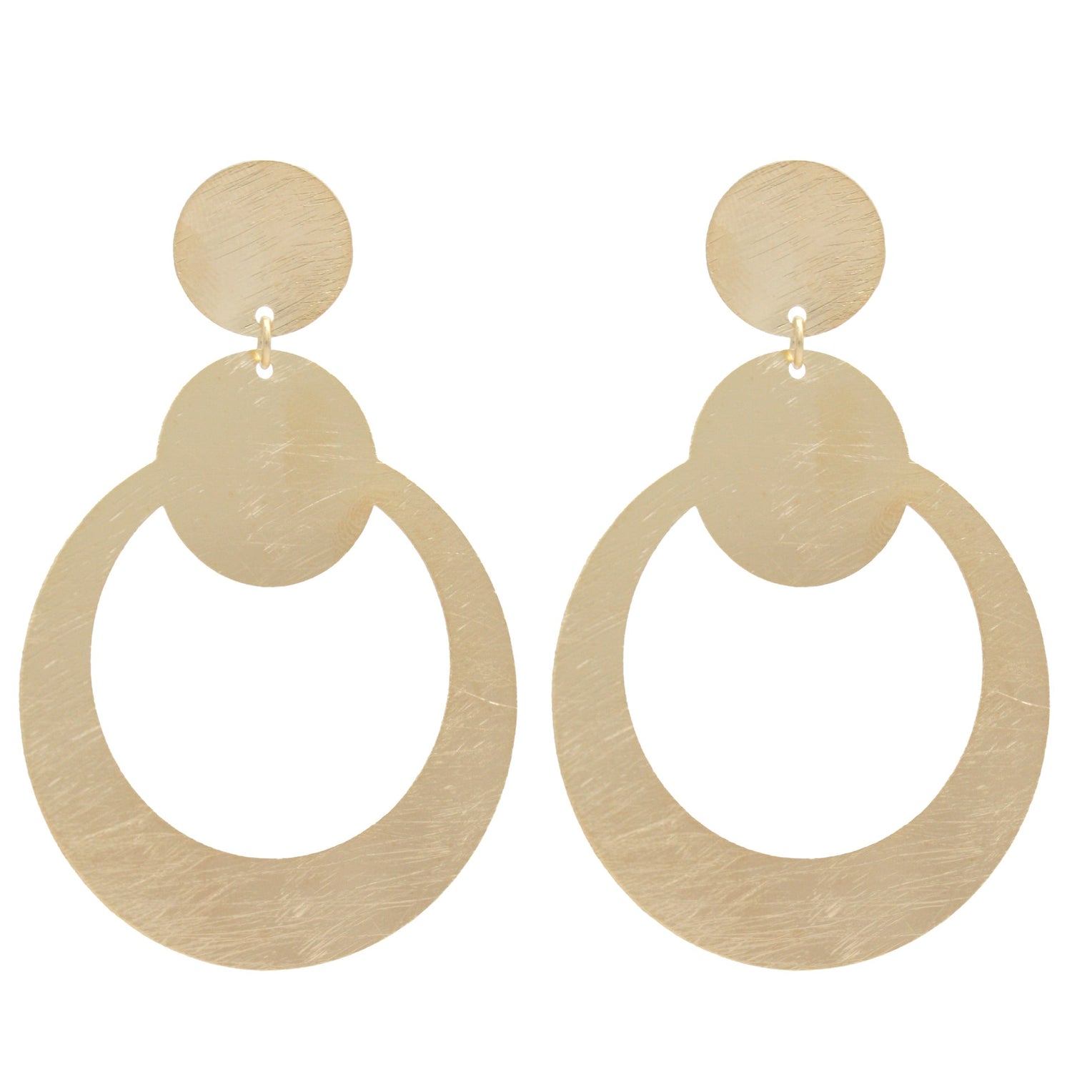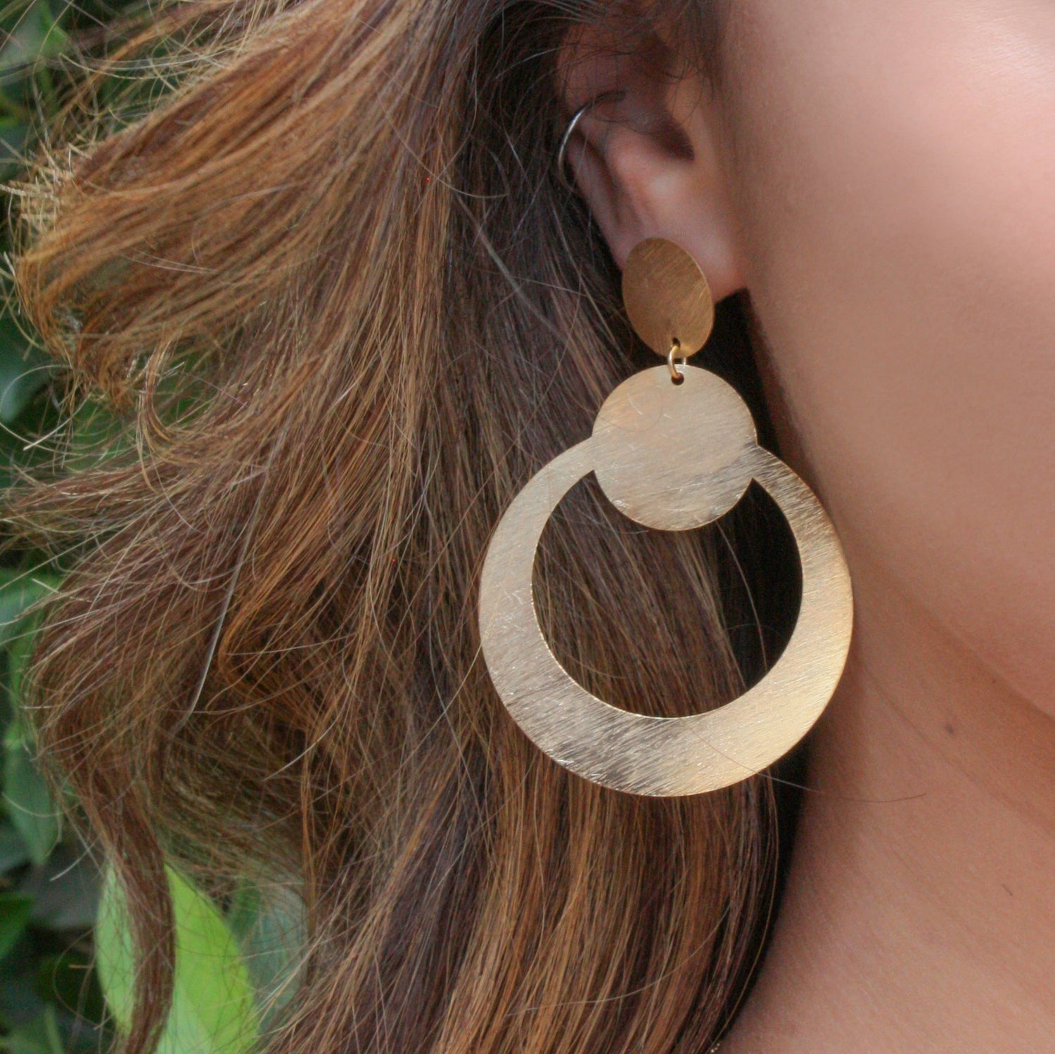 These 18k gold plated large statement earrings feature a brushed gold texture and a striking open loop design, offering a contemporary and bold look. Measuring 2.5 inches long, they provide a dramatic presence while remaining lightweight for comfortable wear. Made in Brazil, these earrings combine high-quality craftsmanship with a modern aesthetic.
