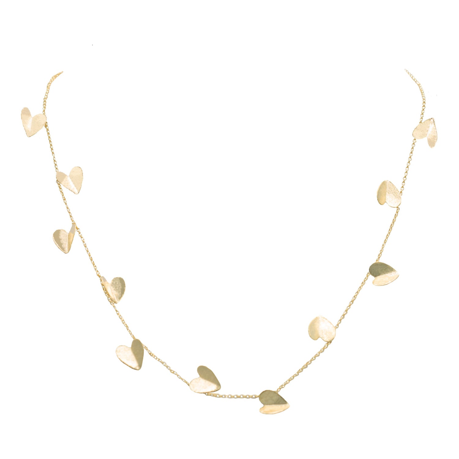 Handmade in Brazil, this 34" long necklace is beautifully crafted with folded heart charms and finished in radiant 18K gold plating. Each heart features a delicate, sculptural design that adds texture and dimension, creating a romantic yet contemporary look. The generous length allows for versatile styling—wear it long for an elegant silhouette or double it for a layered effect.