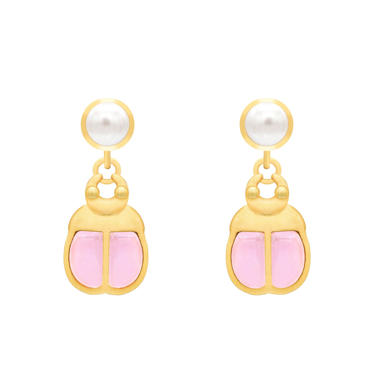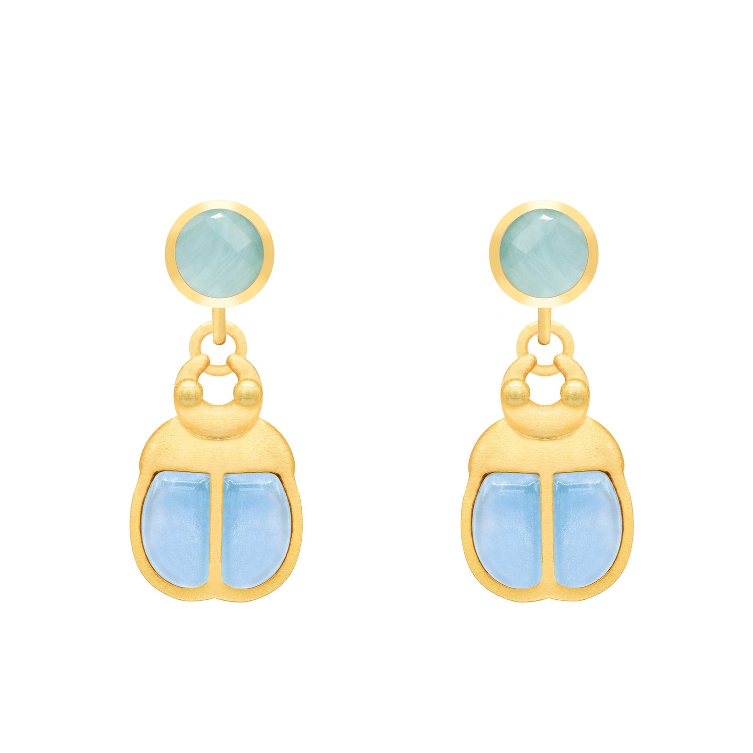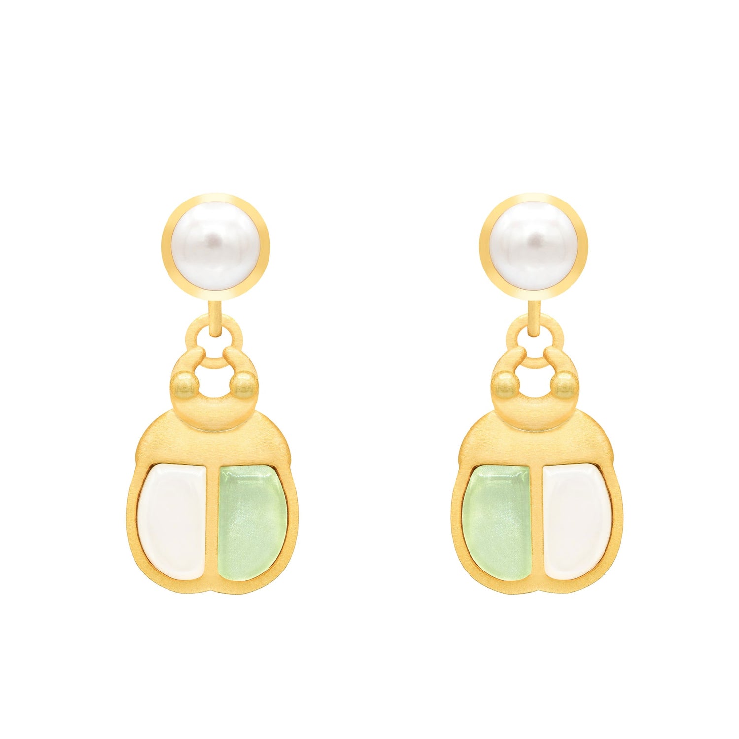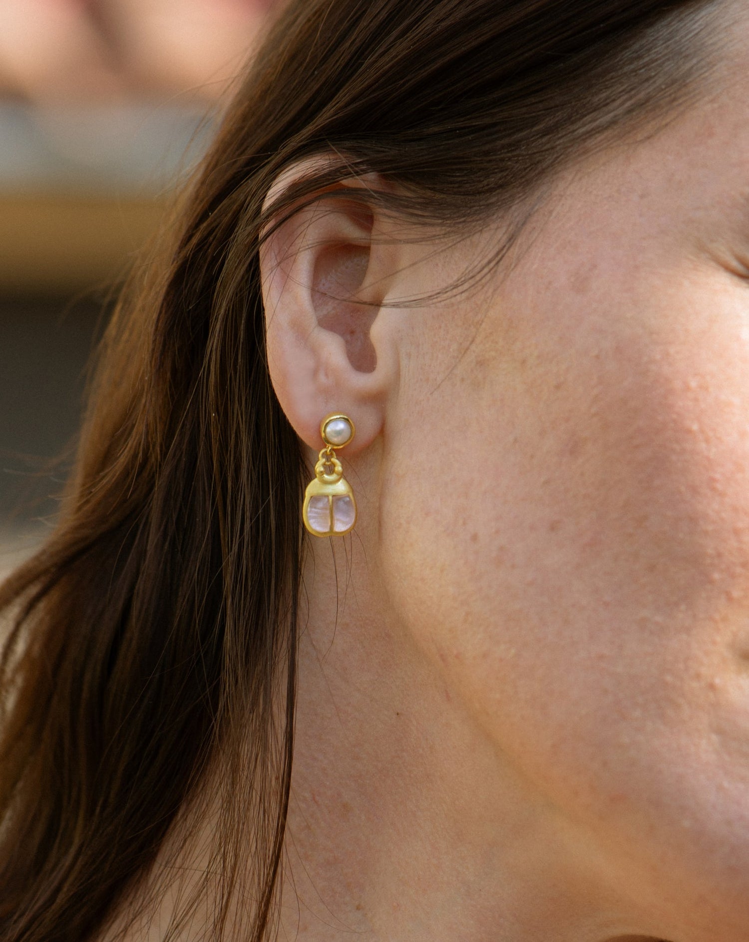 18k gold plated beetle earrings attached to a stone stud. Measures 1" long