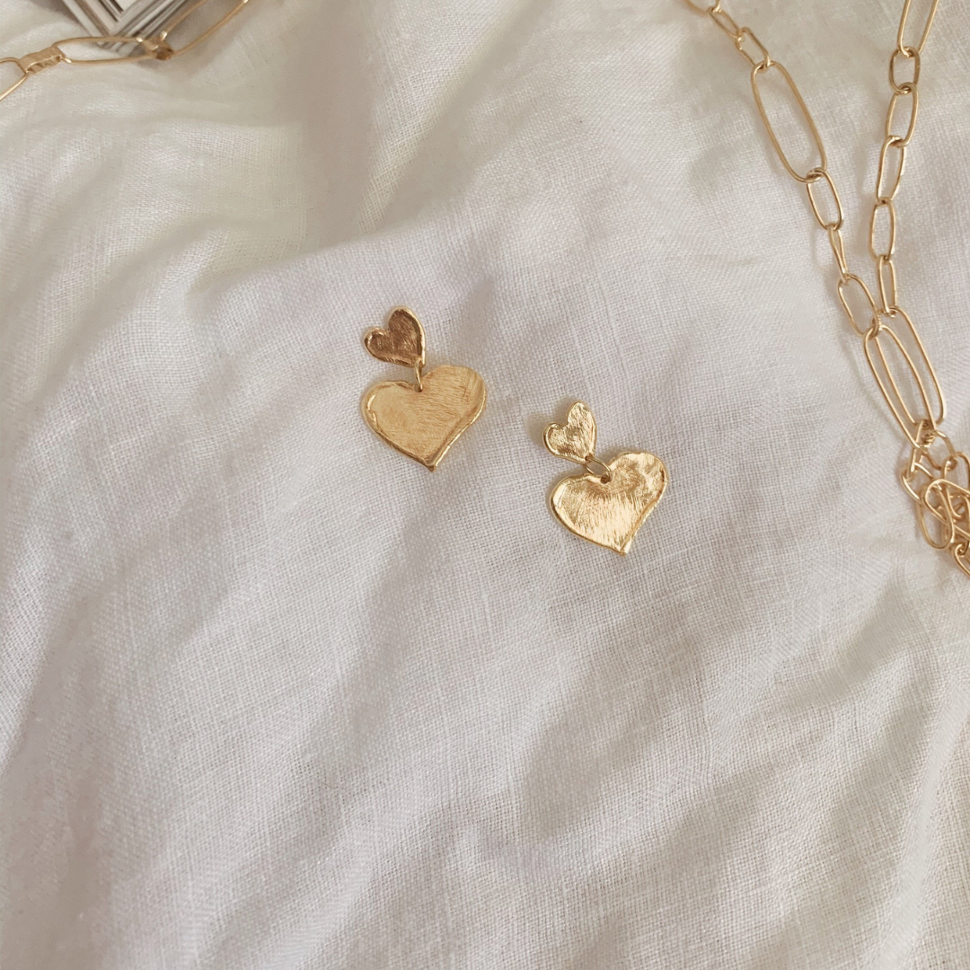 These 18k gold plated small teardrop molten heart earrings measure 0.7 inches, offering a delicate yet distinctive touch. They pair beautifully with the Vera or Hania Necklaces, creating a coordinated and elegant look. Handmade in Brazil, these earrings exemplify exceptional craftsmanship and thoughtful design.