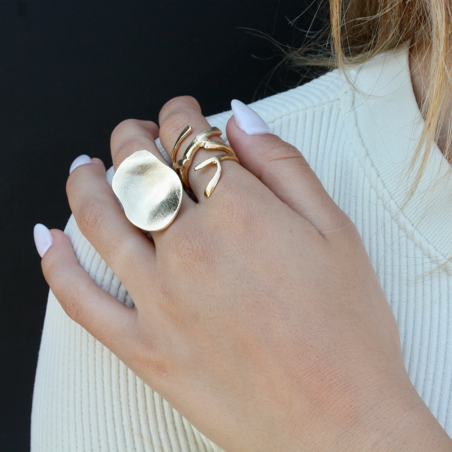 This 18k gold-plated cocktail ring features a cool, organic-shaped coin that gives it a laid-back yet stylish vibe. Made in Brazil, it has a unique touch and high-quality feel. Perfect for adding a bit of flair to your everyday look!