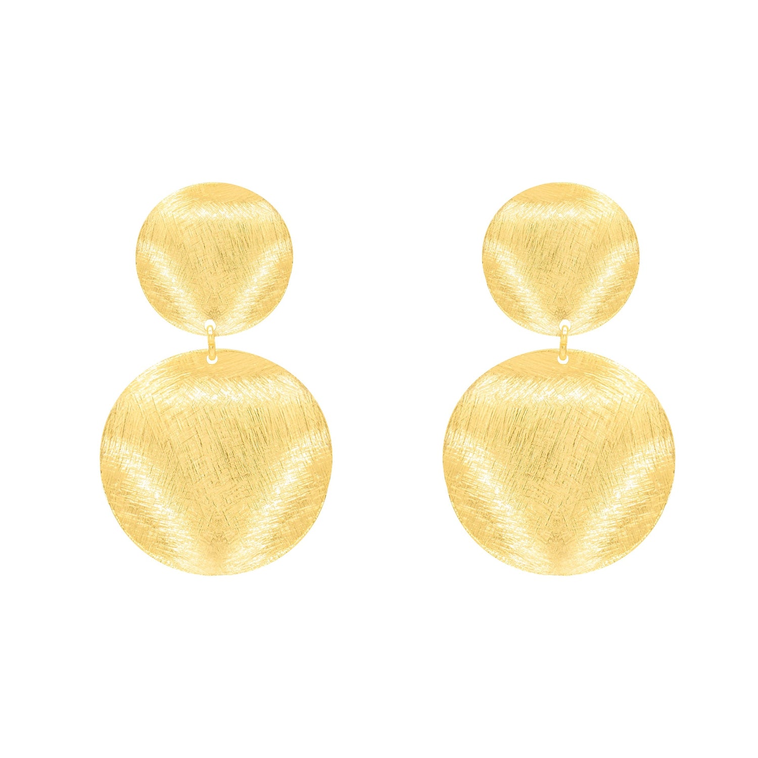 These 18K gold-plated earrings feature two beautifully textured wave disks, creating a dynamic, flowing design that catches the light from every angle and measures 1.25 inches in length.