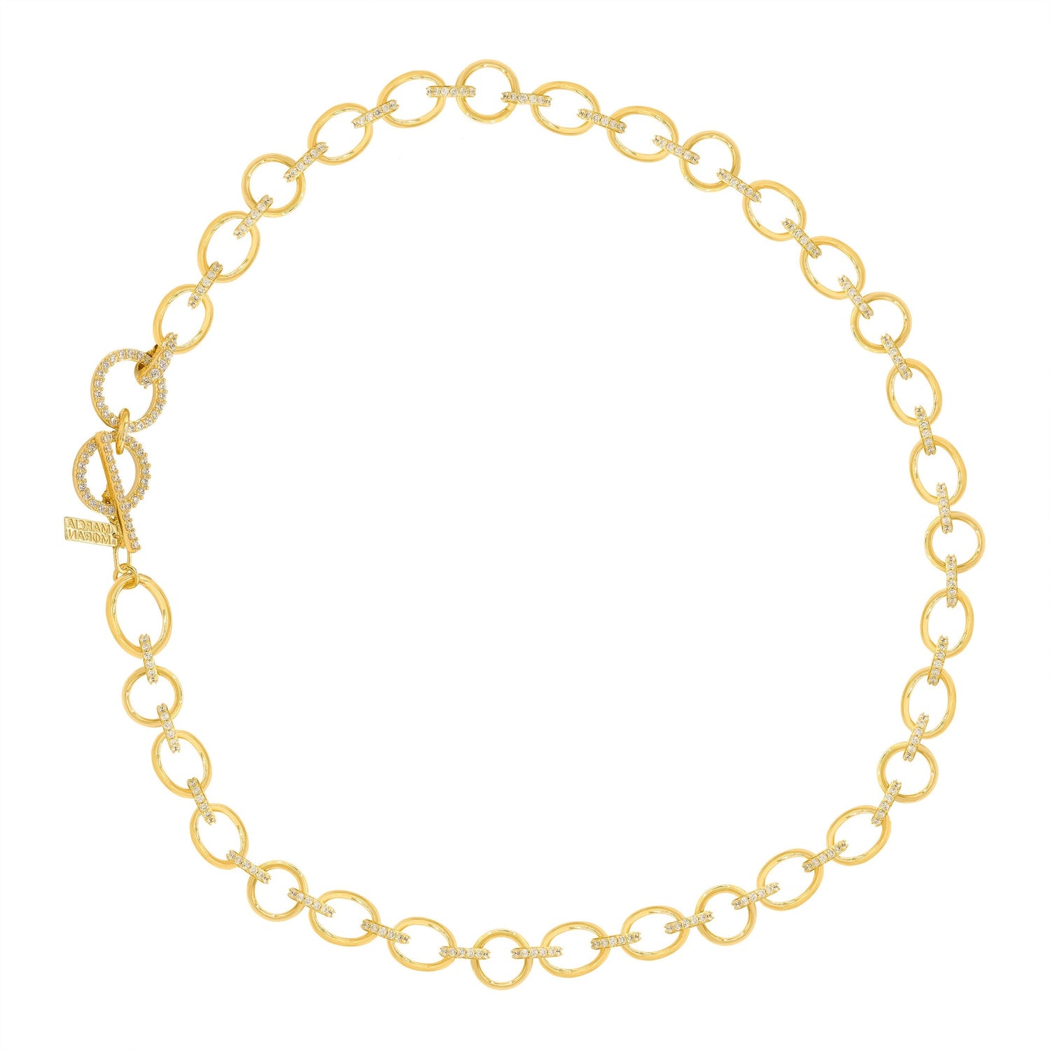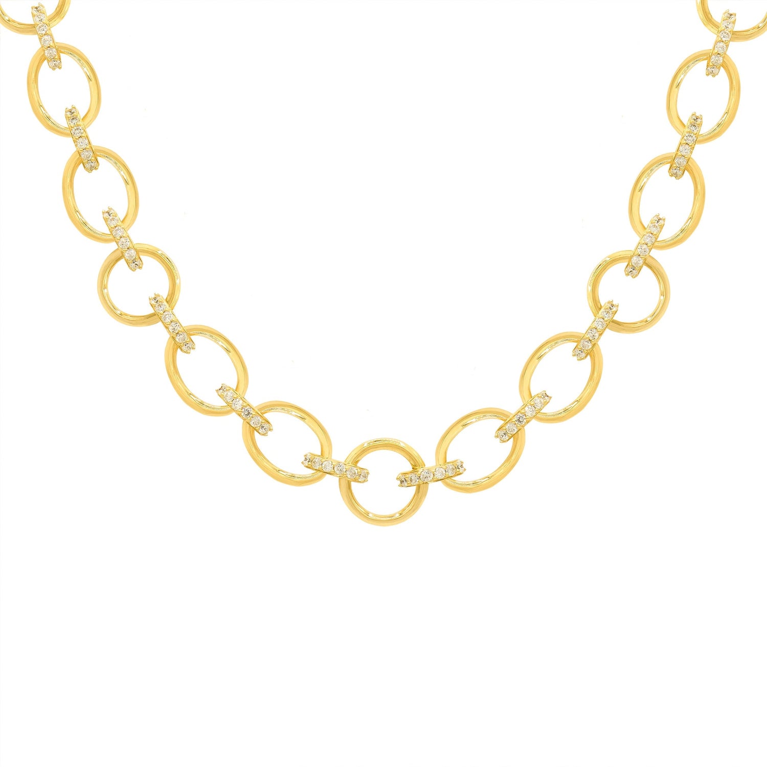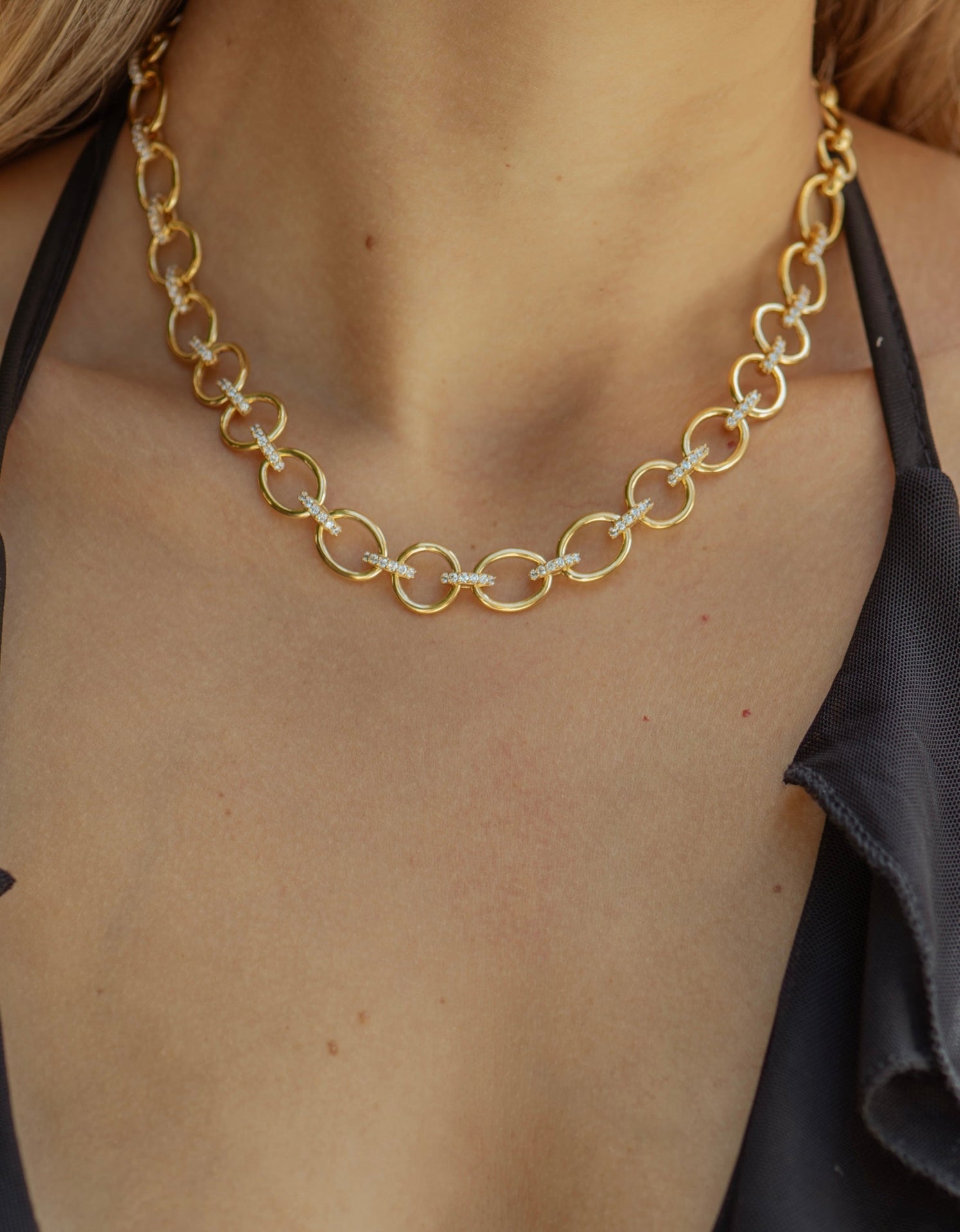 18k gold plated necklace with interlinked cz rings. Measures 17" long.