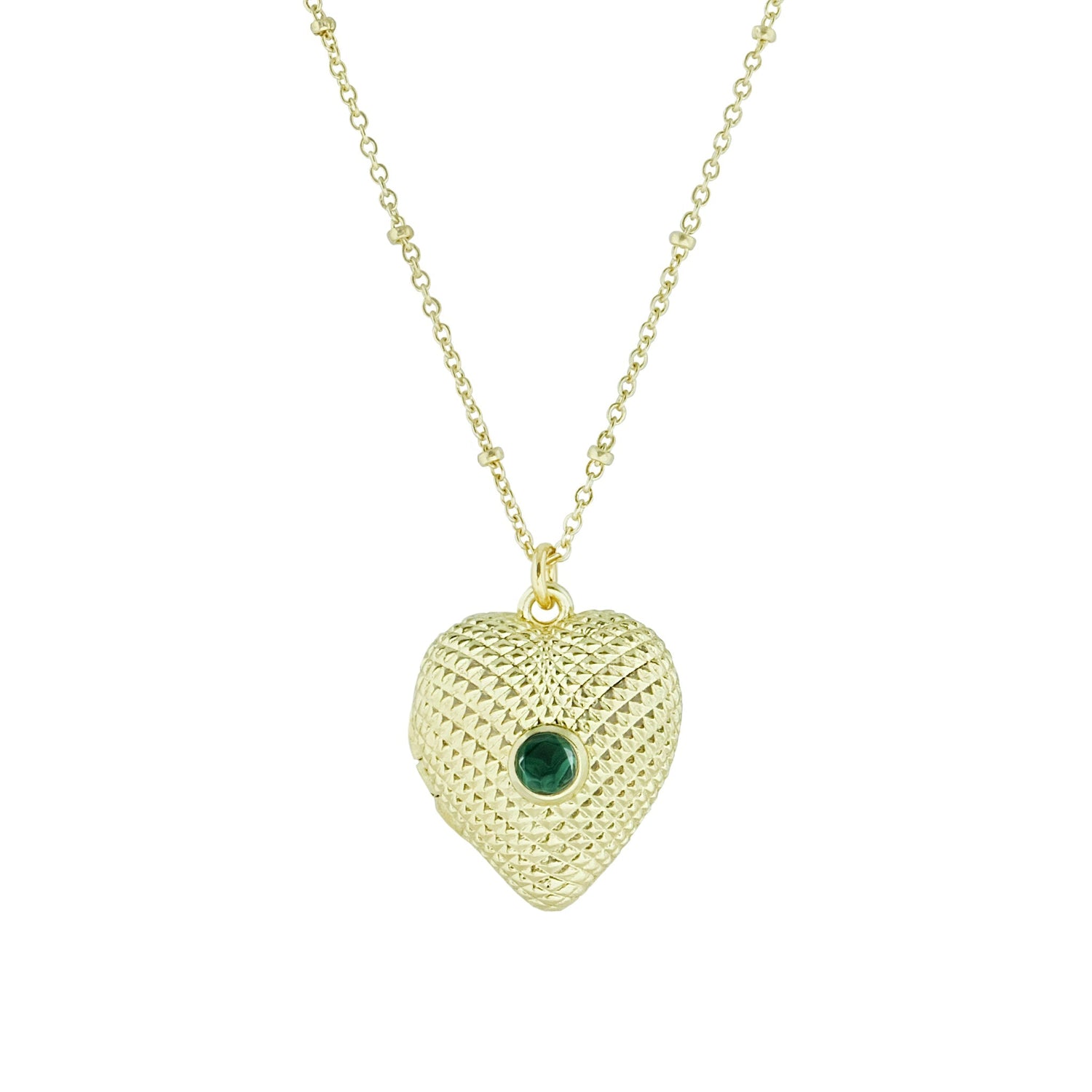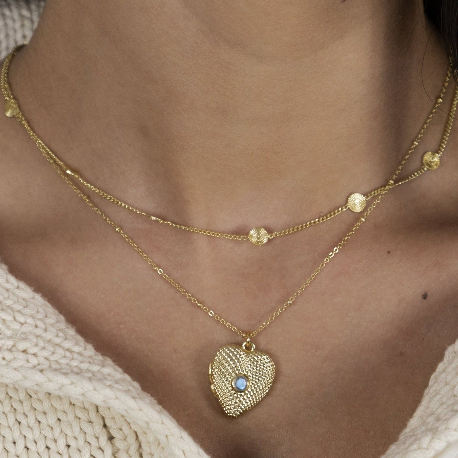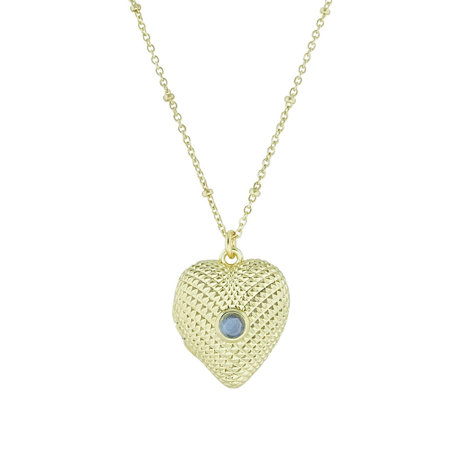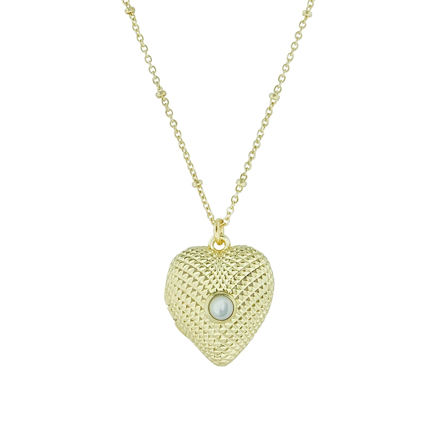 -18k gold plated short necklace with a textured heart locket charm with a stone