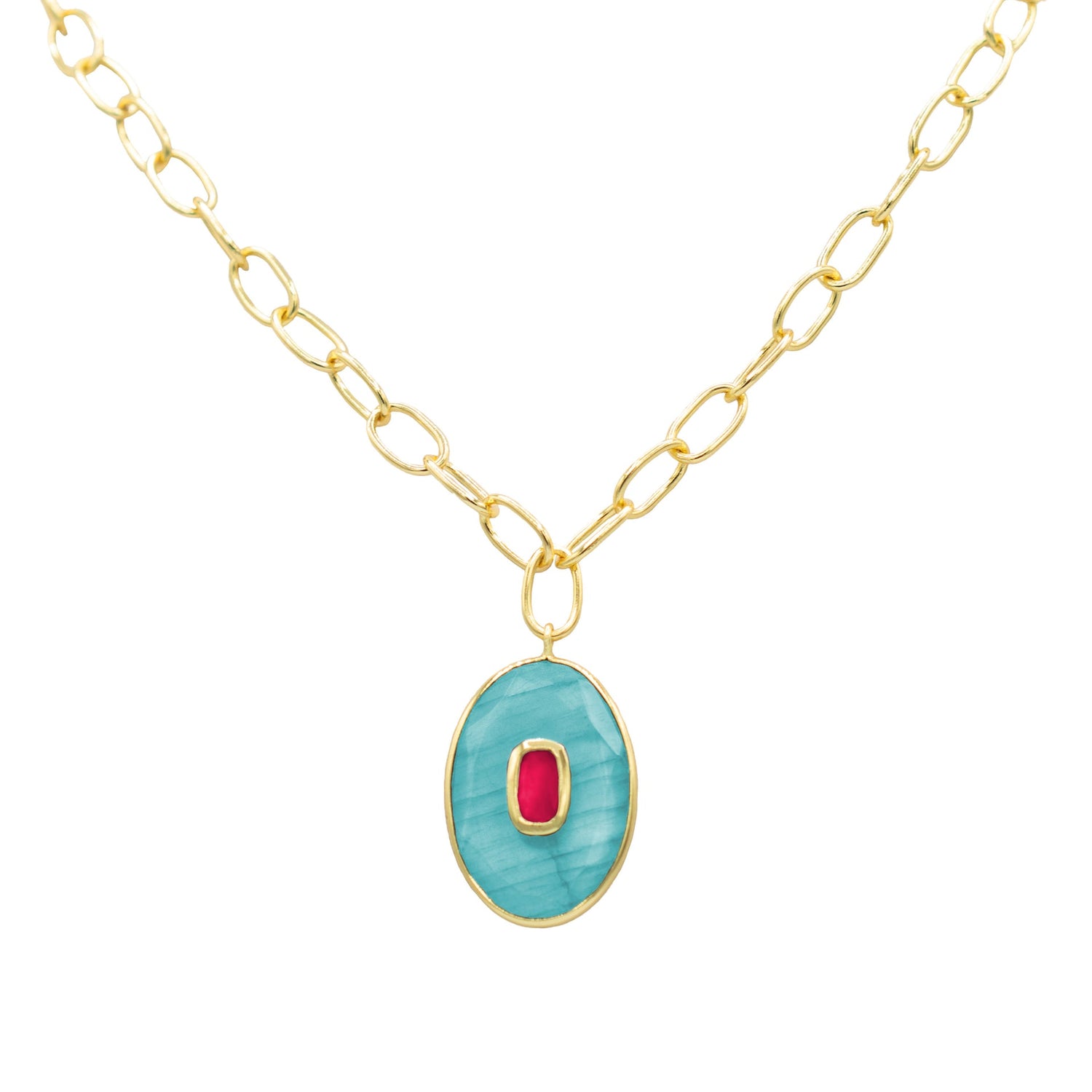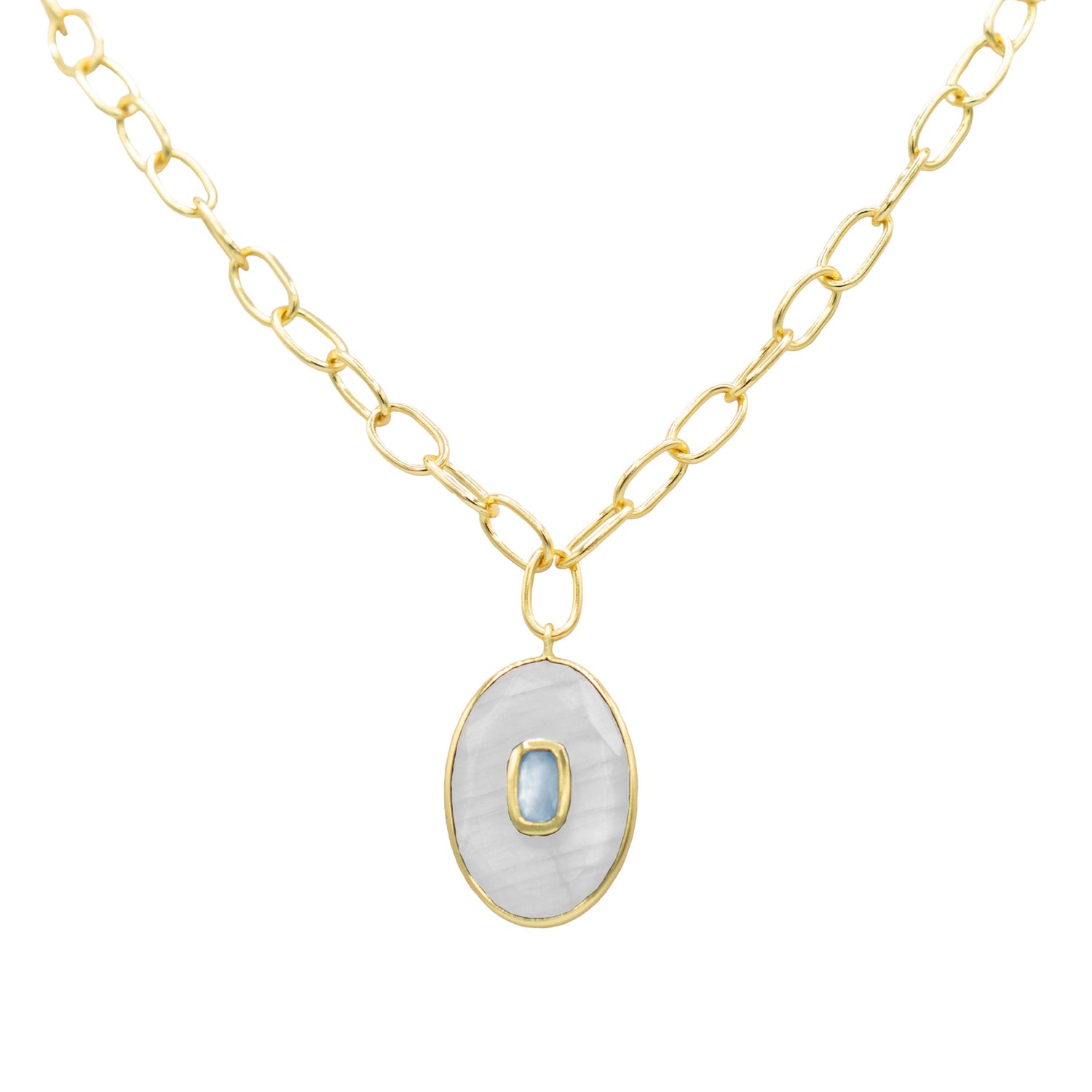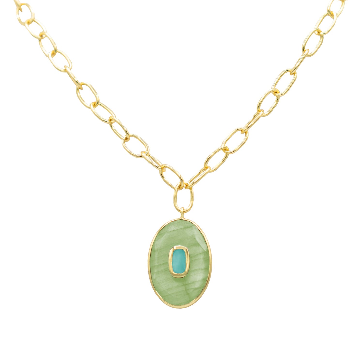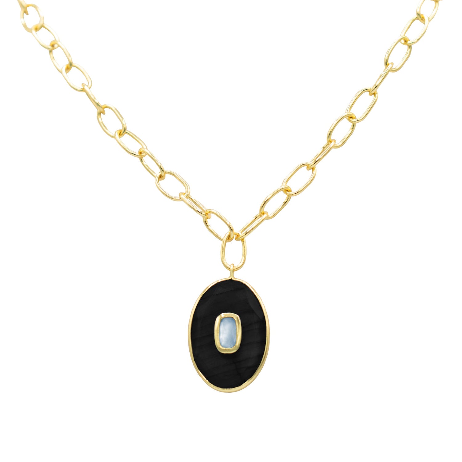 This necklace features a bold 19" chain with an oval pendant accented by a smooth inlay stone at the center. Crafted in 24k gold plated brass, the 1.25" pendant blends organic texture with modern elegance, making it a versatile piece that elevates both everyday and evening looks.