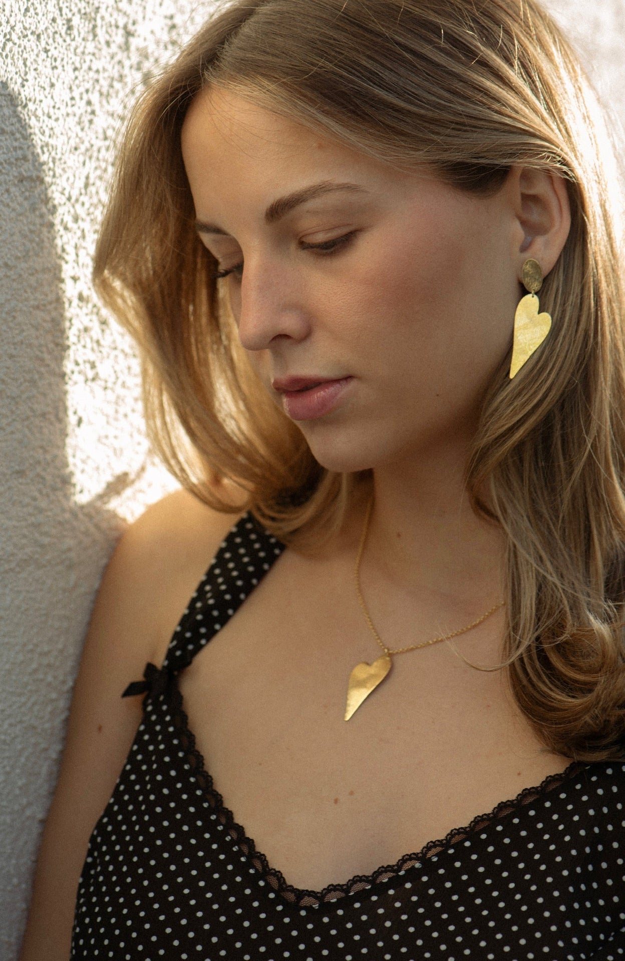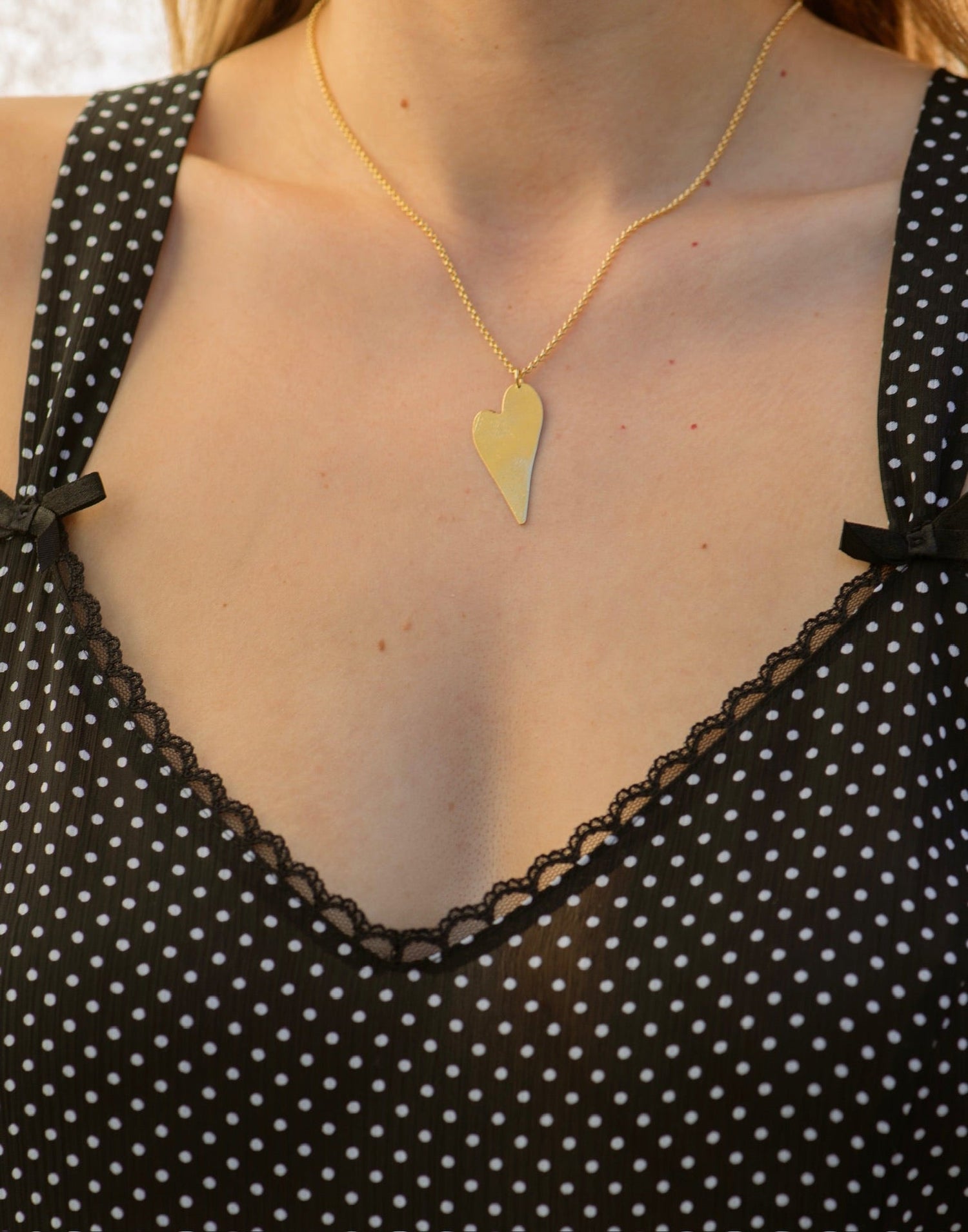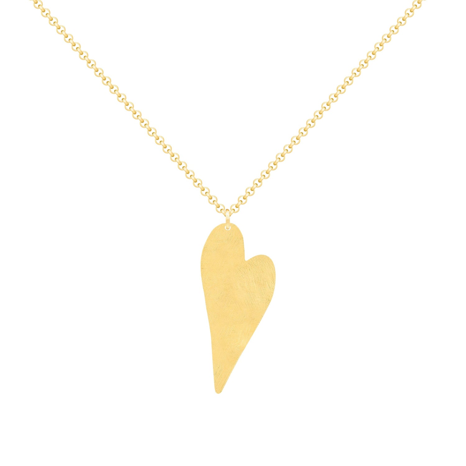 18k gold plated necklace with a heart pendant attached. Chain measures 16" long with 2" extender. Pendant measures 1.5" long and .75" wide at the widest part of the heart.