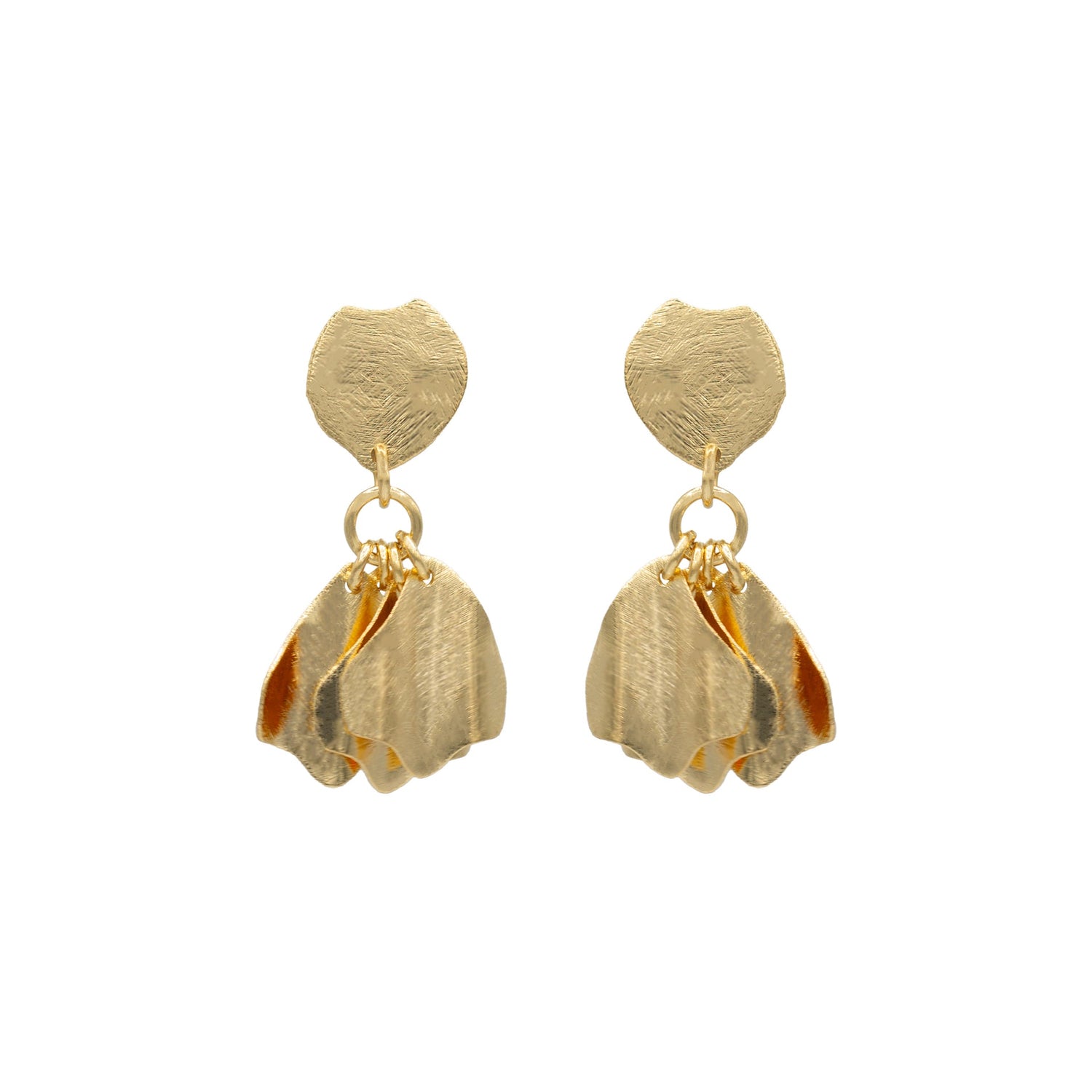 18k gold plated earrings featuring layered petal-like drops with a soft brushed texture for a fluid, organic look. Lightweight and elegant, they sway beautifully with every movement. Handmade in Brazil.