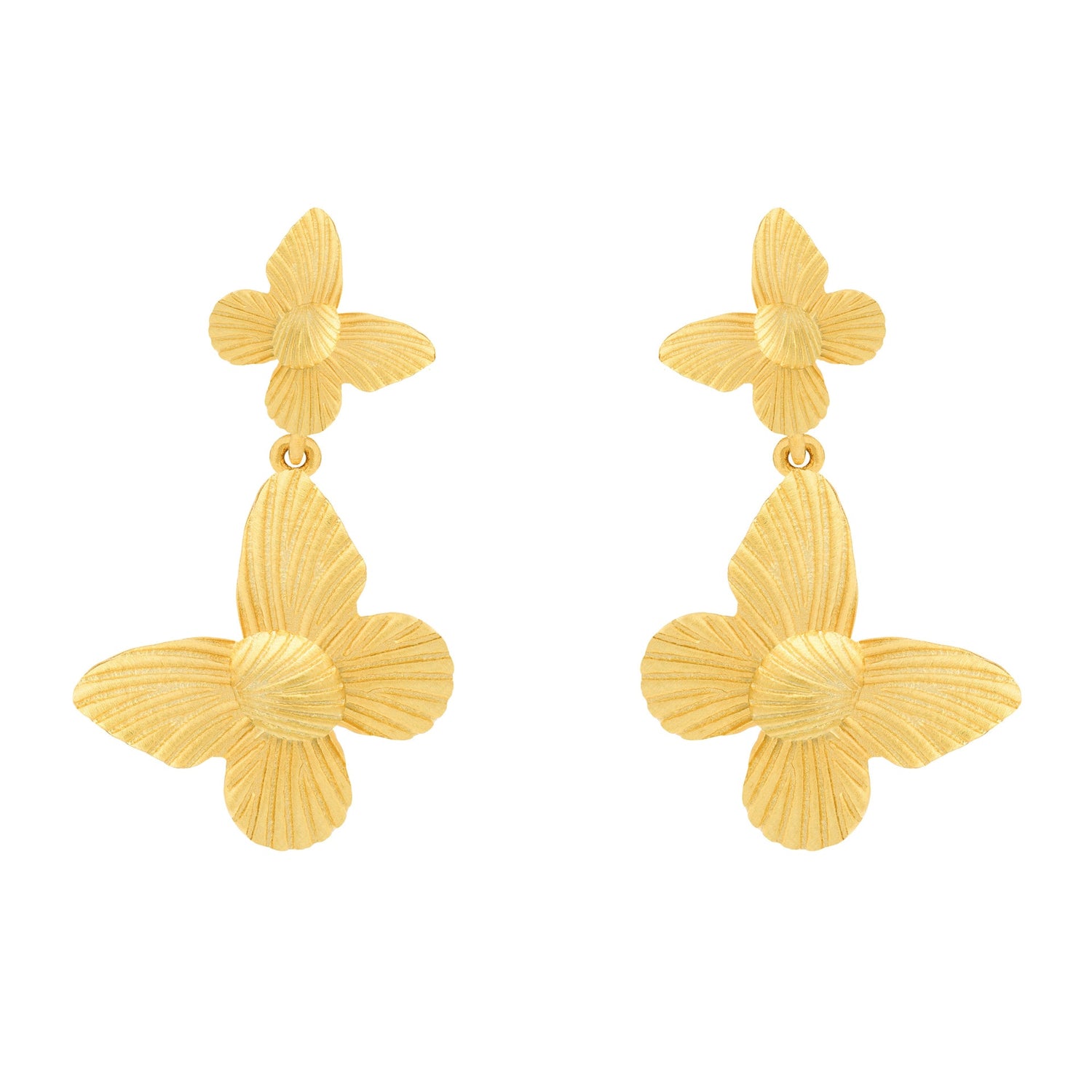 18k gold plated earrings with two embossed butterflies that cascade down. Measures 1.25" long