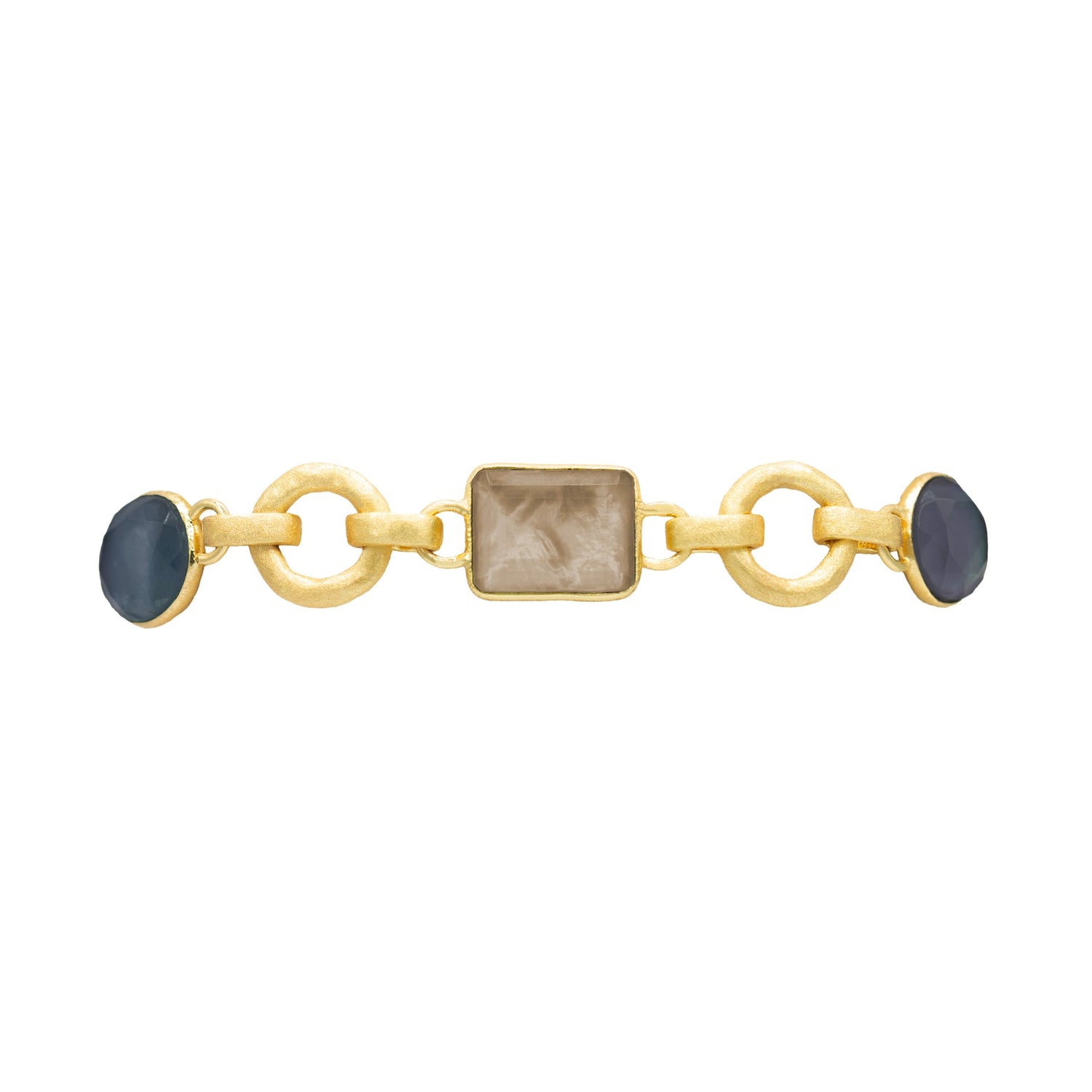 24k gold plated link bracelet featuring an array of bezel-set geometric accents and textured circular links. Finished with a toggle clasp, this piece offers a bold yet refined look that pairs effortlessly with any style.