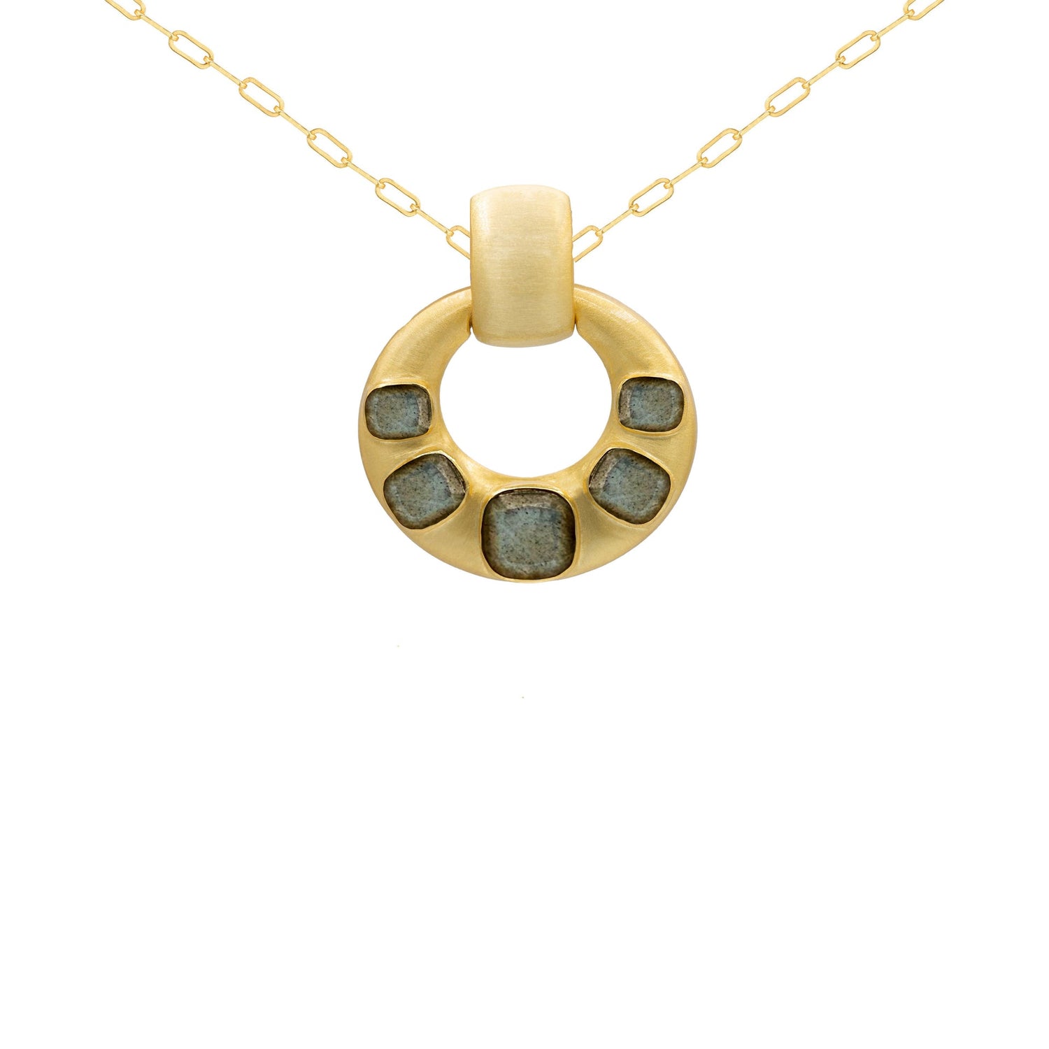 24k gold plated necklace featuring a circular pendant in a brushed finish, accented with five organically set stones. The pendant hangs from a delicate 18-inch chain.. A bold yet timeless piece that adds a sculptural touch to any look.