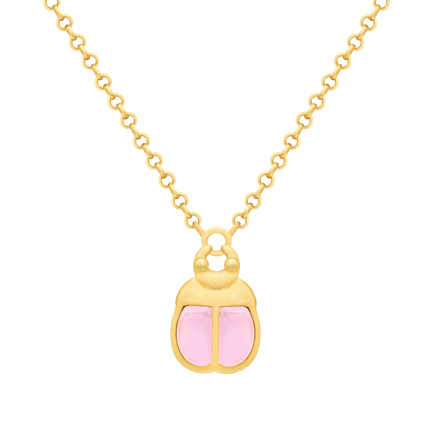 18k gold plated necklace with a stone beetle charm attached in the center. Chain measures 18" long, beetle charm measures .5".
