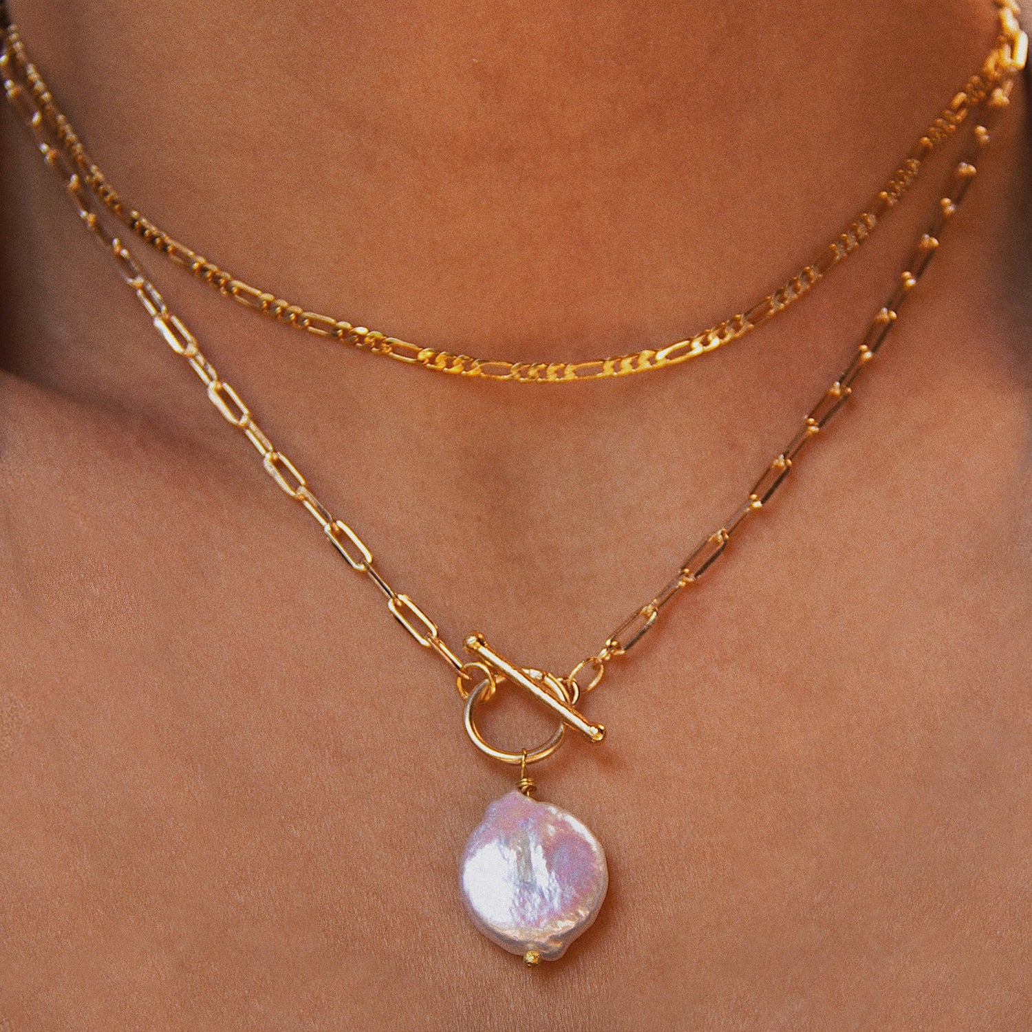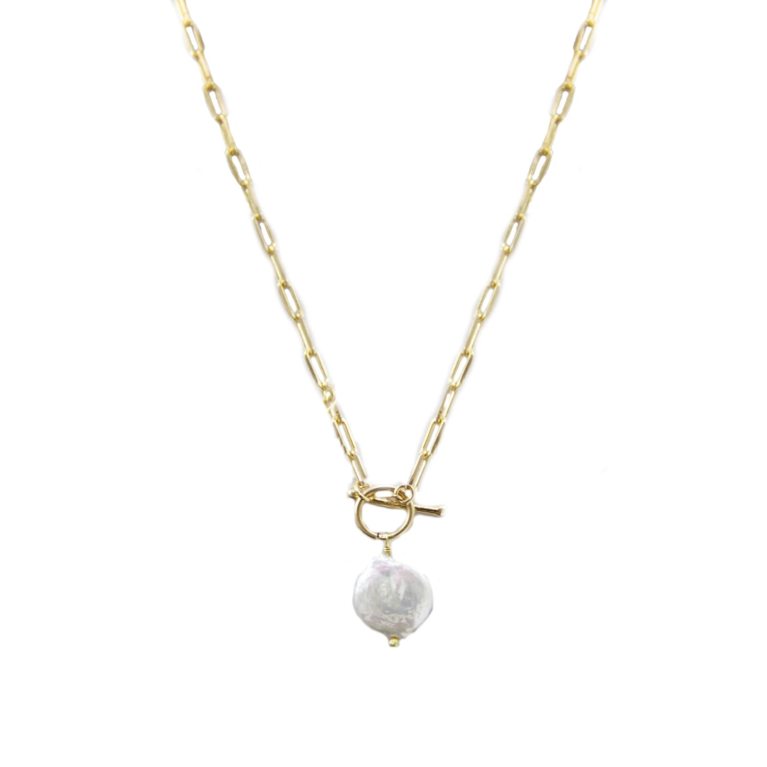 - 18k gold plated paper clip chain with a T bar clasp and freshwater pearl attached