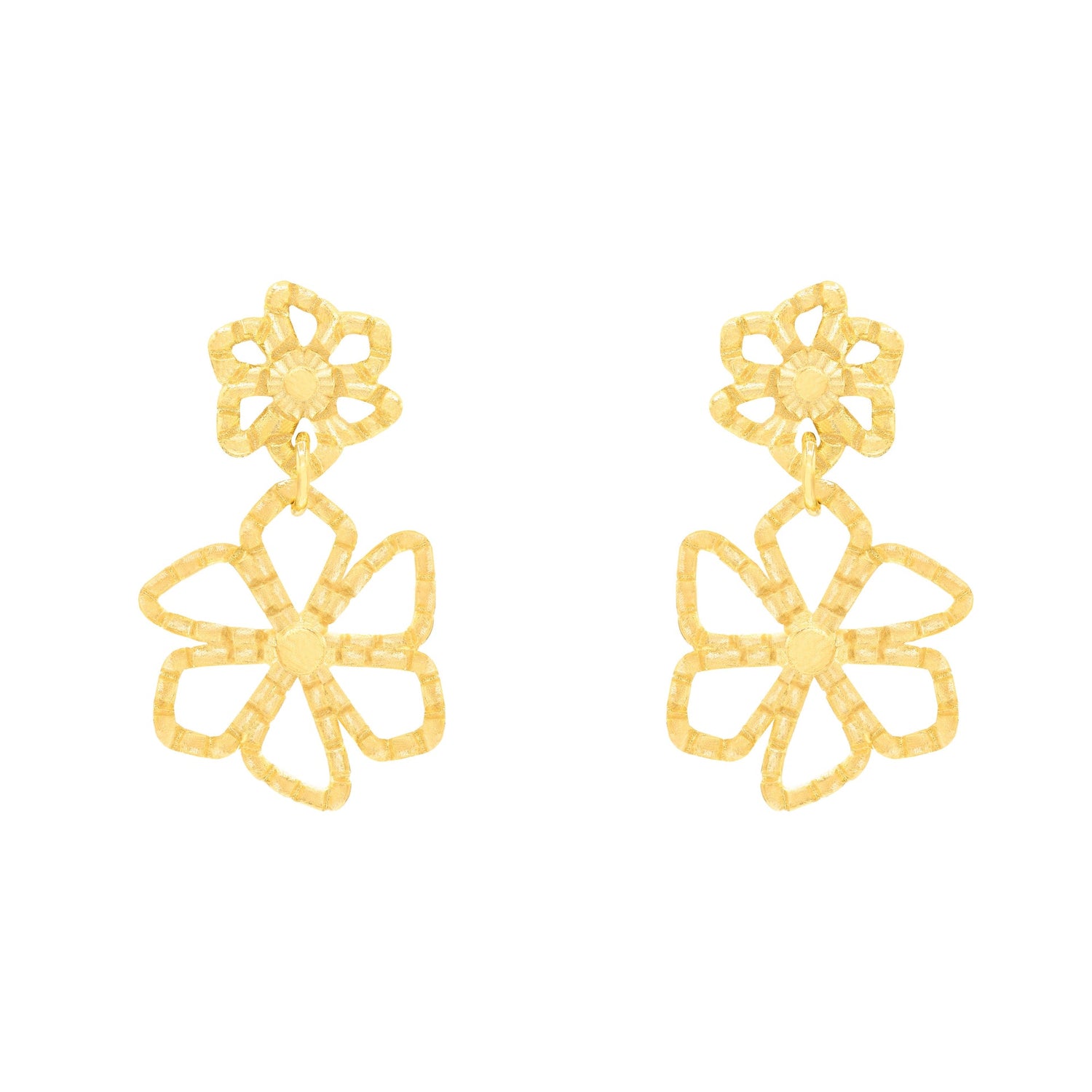 18k gold plated earrings made of two connected wire flowers. Measures 1" long.