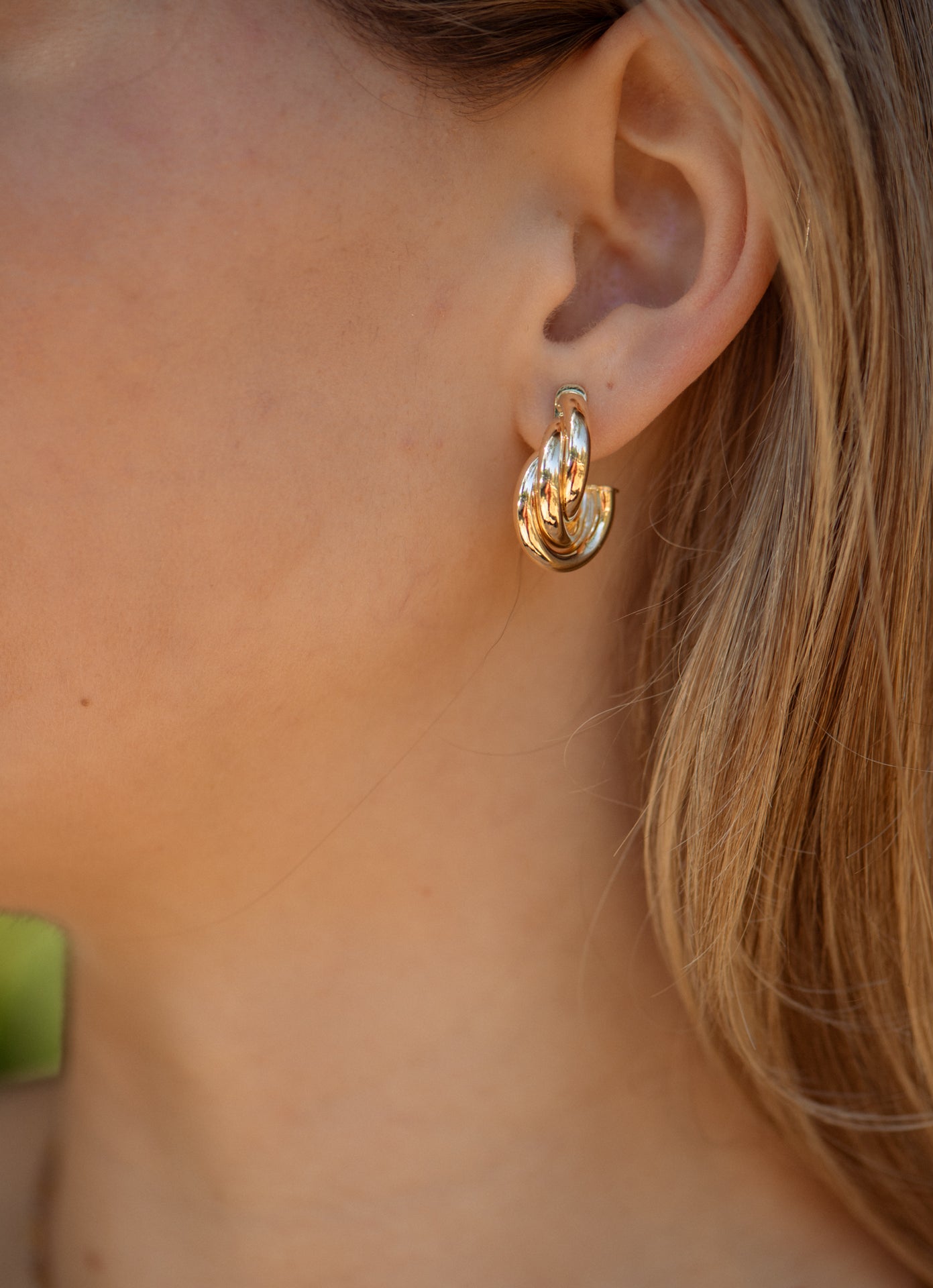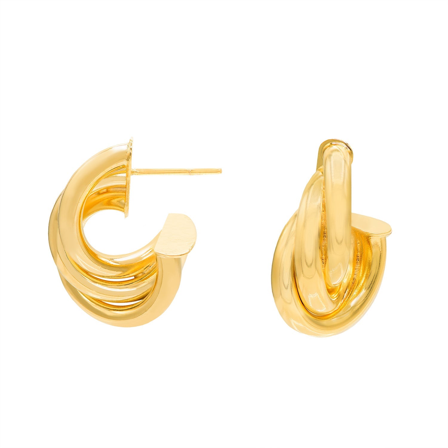 18k gold plated hoop earrings with interlocked twisted bands. Measures .75" long.