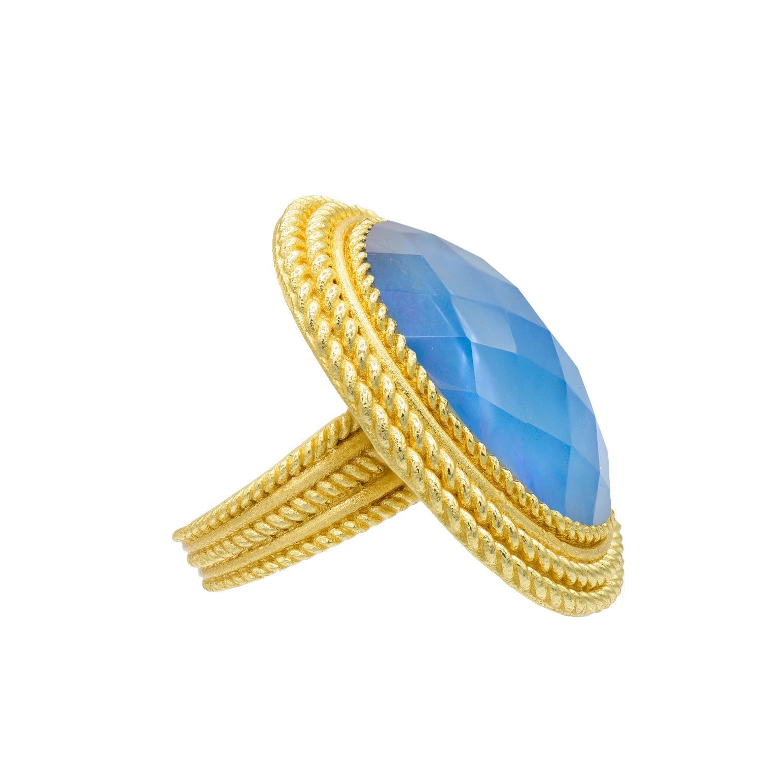 This striking ring is plated in 18k gold, the large oval stone in the center is surrounded by textured gold. Measures 1.5" tall.