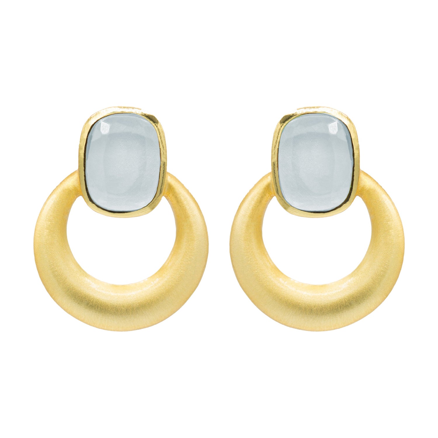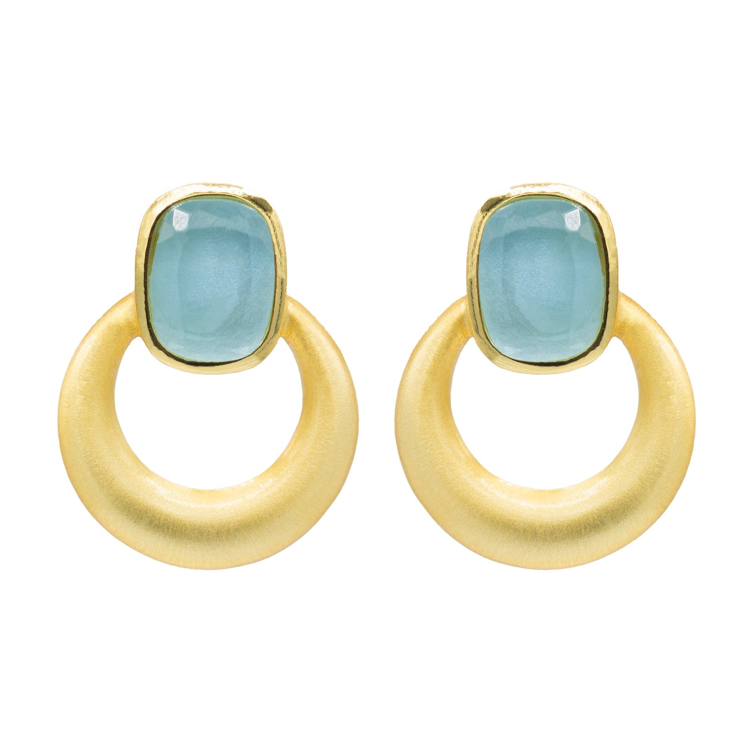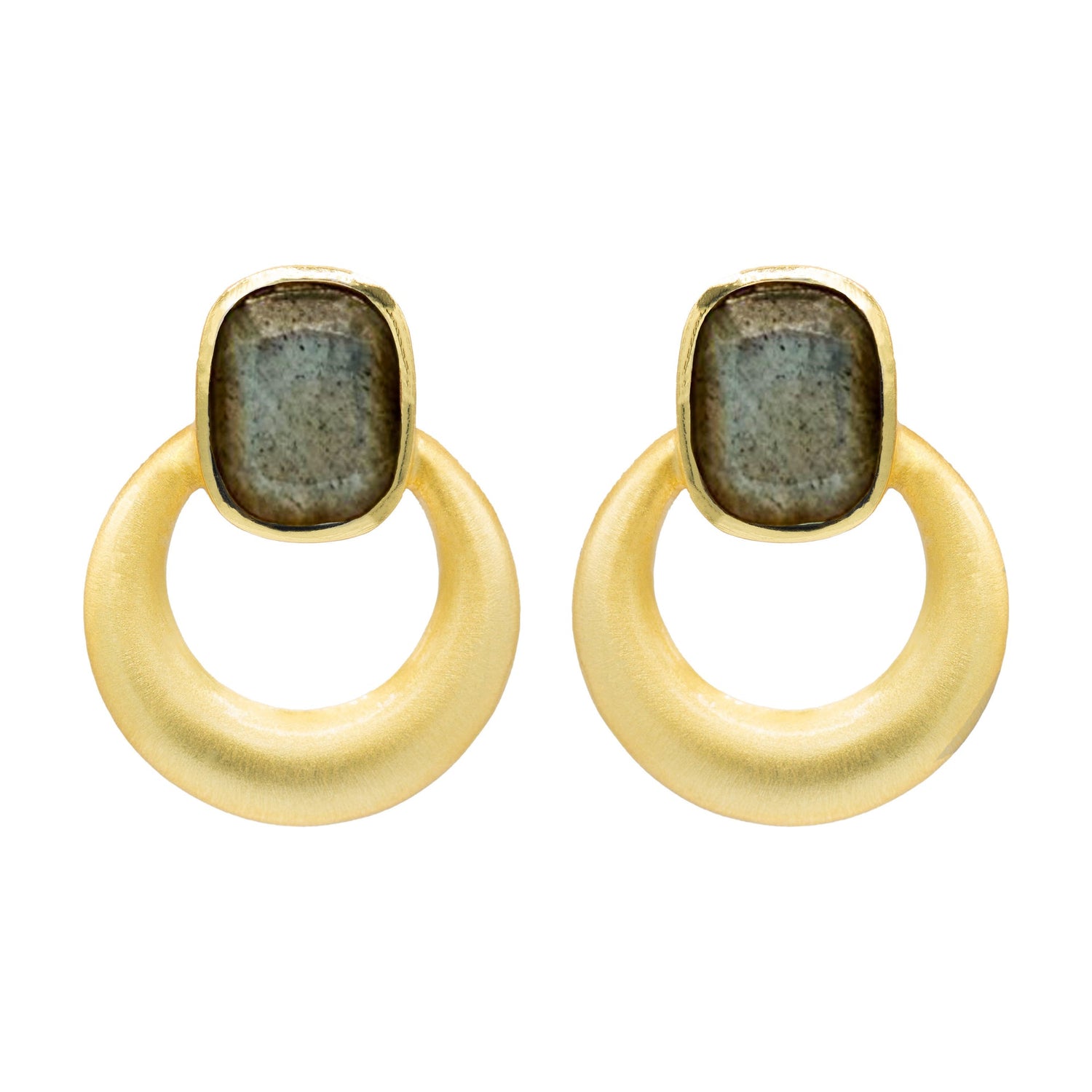 These elegant earrings feature a modern, minimalist design with a luxurious touch. Crafted in 24k gold plating with a brushed finish, each piece showcases a smooth open ring suspended from a cushion-cut labradorite-like stone that shimmers subtly in the light. Compact and stylish, these earrings measure approximately half an inch long, making them perfect for everyday wear or layering with other pieces.