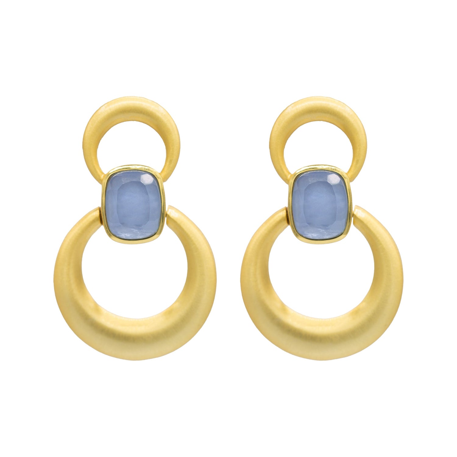 This elegant earring features a sculptural silhouette crafted in 24k gold plating with a smooth, brushed finish that gives it a modern matte glow. At the center, a cushion-cut labradorite stone is bezel-set between two open circular forms, creating a striking and fluid design. The top circle connects to a post back, allowing the earring to sit gracefully on the ear. Measuring 1.5 inches long, it offers a bold yet lightweight presence, perfect for both day and evening wear.