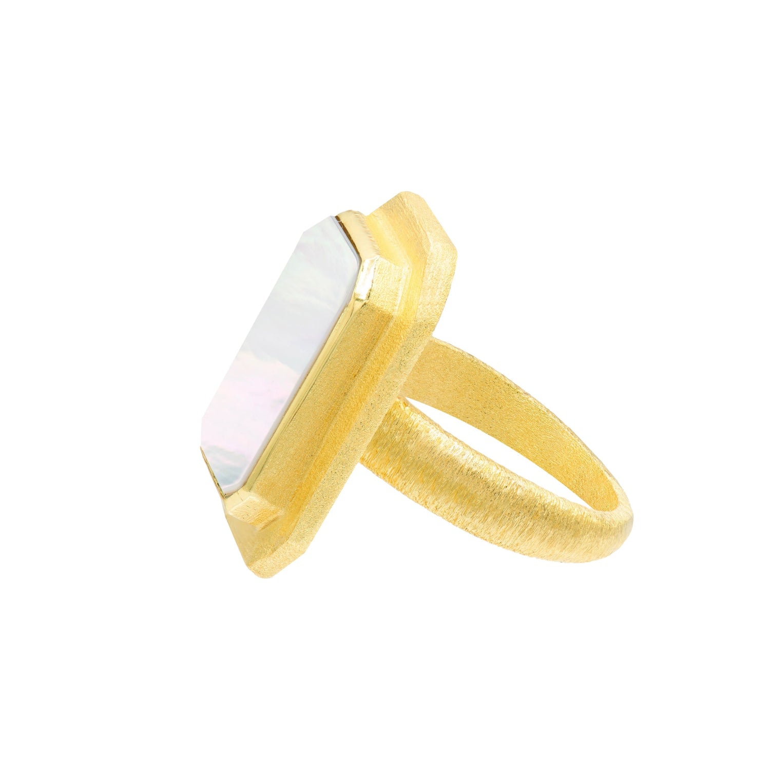 18k gold plated ring with an elongated octagon shape in a bezel setting. Stone measures .75" wide and 1" long
