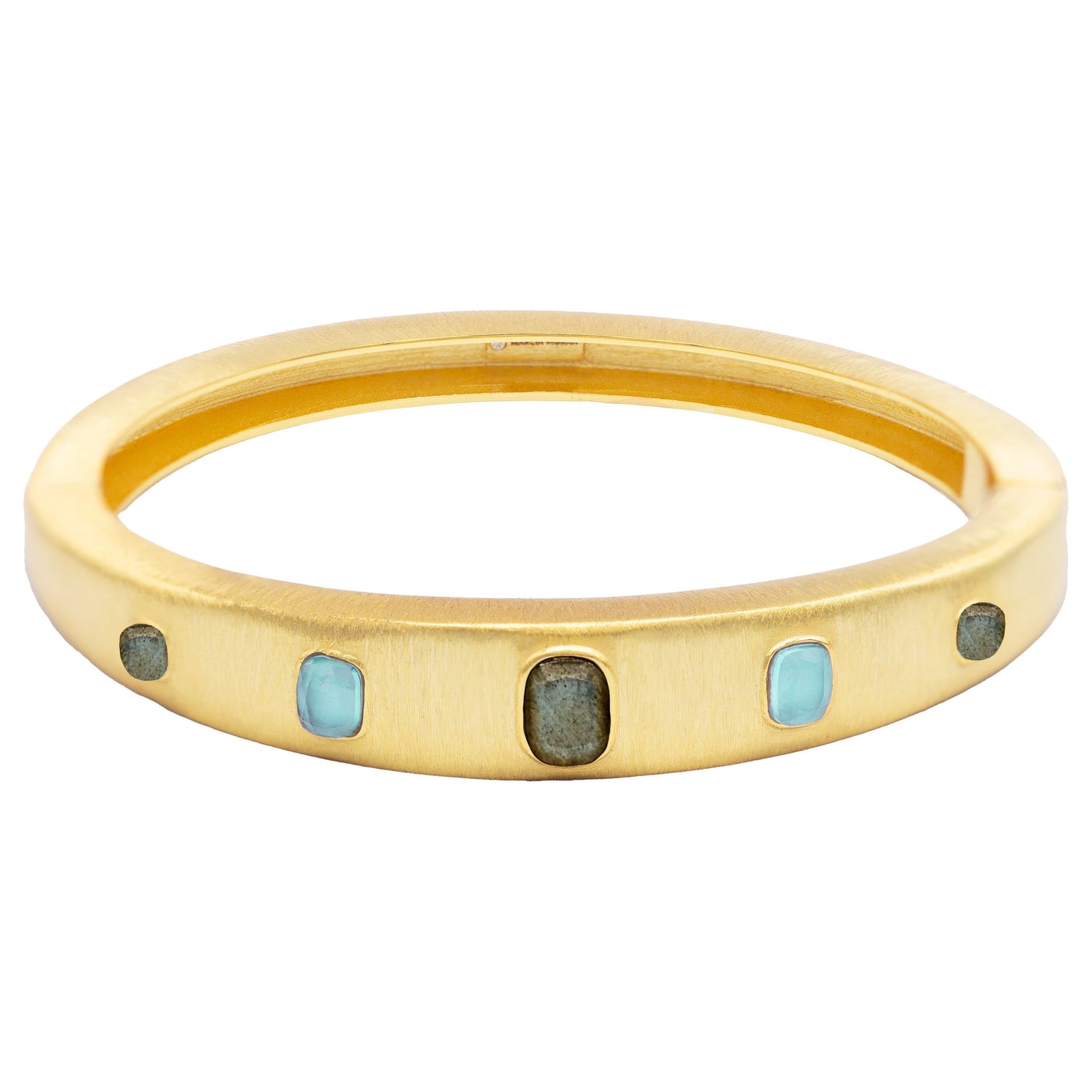 This elegant 24k gold plated bangle features soft blue cabochon stones set into a brushed matte finish. Sleek and modern with a hint of color, it’s perfect for stacking or wearing solo. Handmade in Brazil, each piece showcases subtle variations that make it uniquely yours.