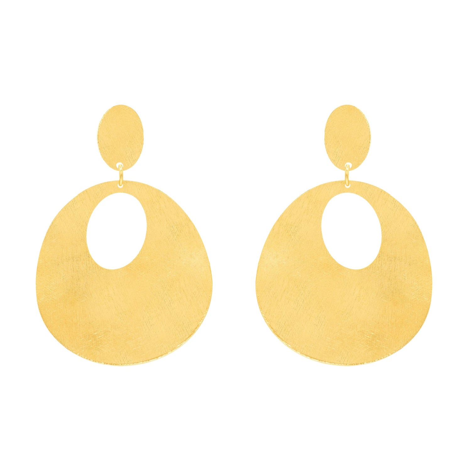 18k gold plated earrings with an open oval disk attached to an elongated oval stud. Measuring 2" long and Handmade in Brazil.