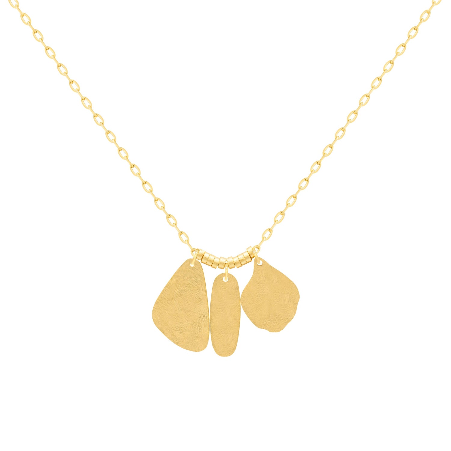 18k gold necklace with three organic-shaped charms and small gold beads attached to the chain. Charms measure .75" and chain measures 16" long with a 2" extender and Handmade in Brazil.