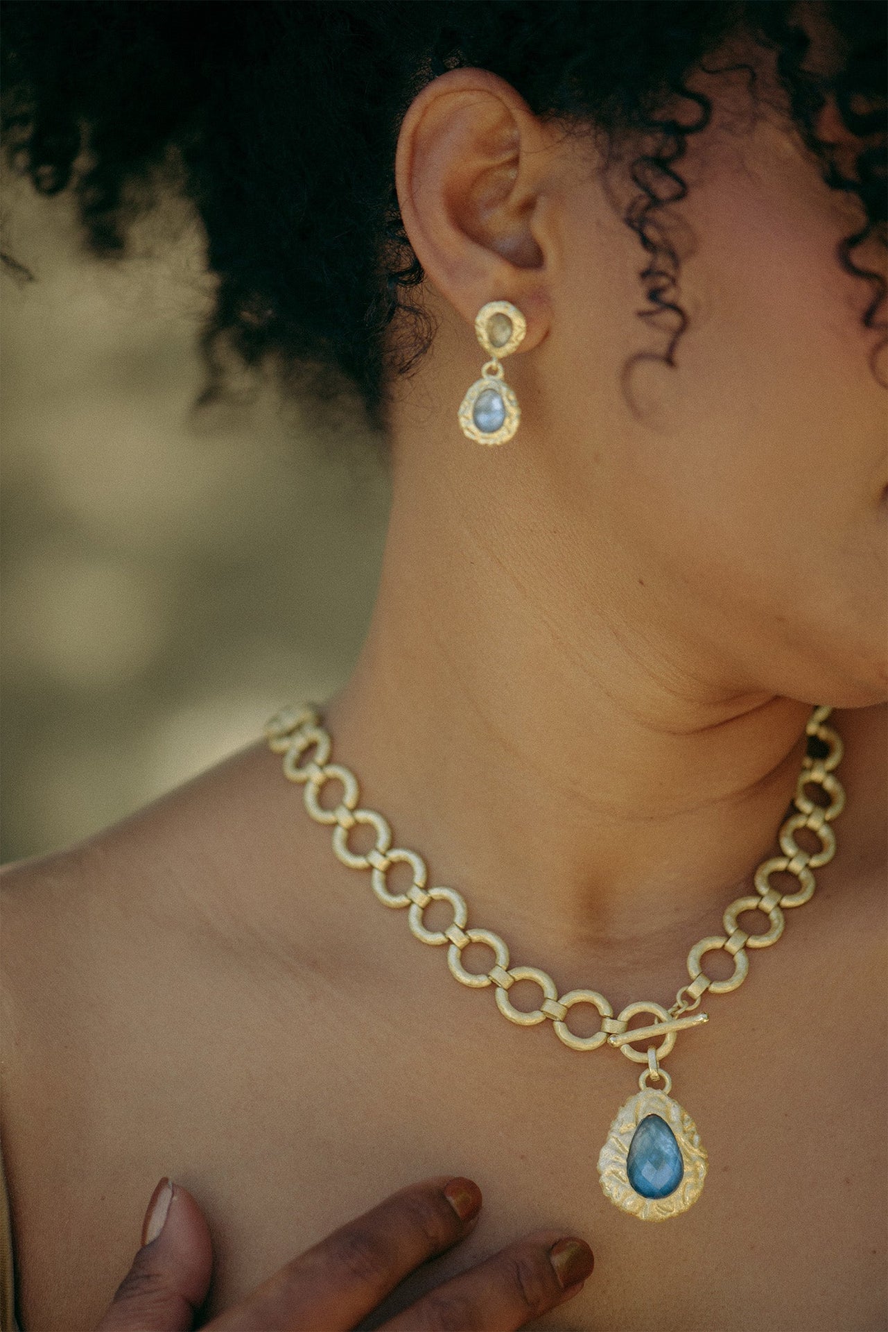 This 18k gold-plated necklace features a circle-link chain with a sleek toggle closure. Hanging from the chain is an organic-shaped pendant with a hammered texture and a central stone. The chain measures 18 inches, while the pendant is 1.25 inches in length. Pairs beautifully with the Malka and Kiki Earrings and Sana Ring.