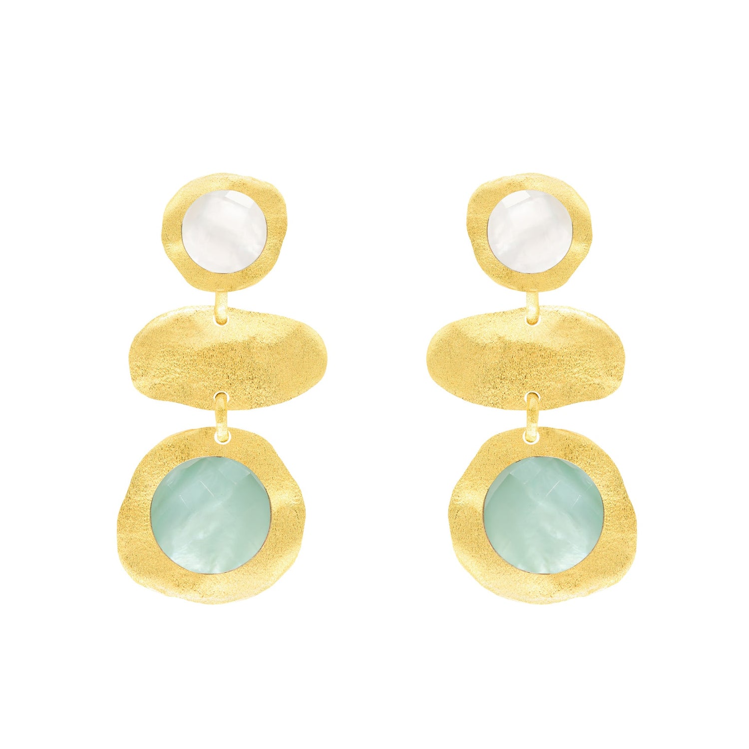 18k gold plated earrings made of organic shapes with stones on the top and bottom. Measures 1.25" long