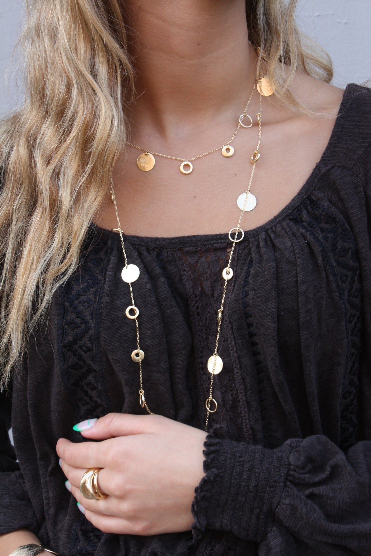 This 32-inch long delicate chain is 18k gold-plated and features a mix of coins and circles. Its elegant design offers a versatile look that can be layered or worn on its own, adding a touch of sophistication to any outfit.