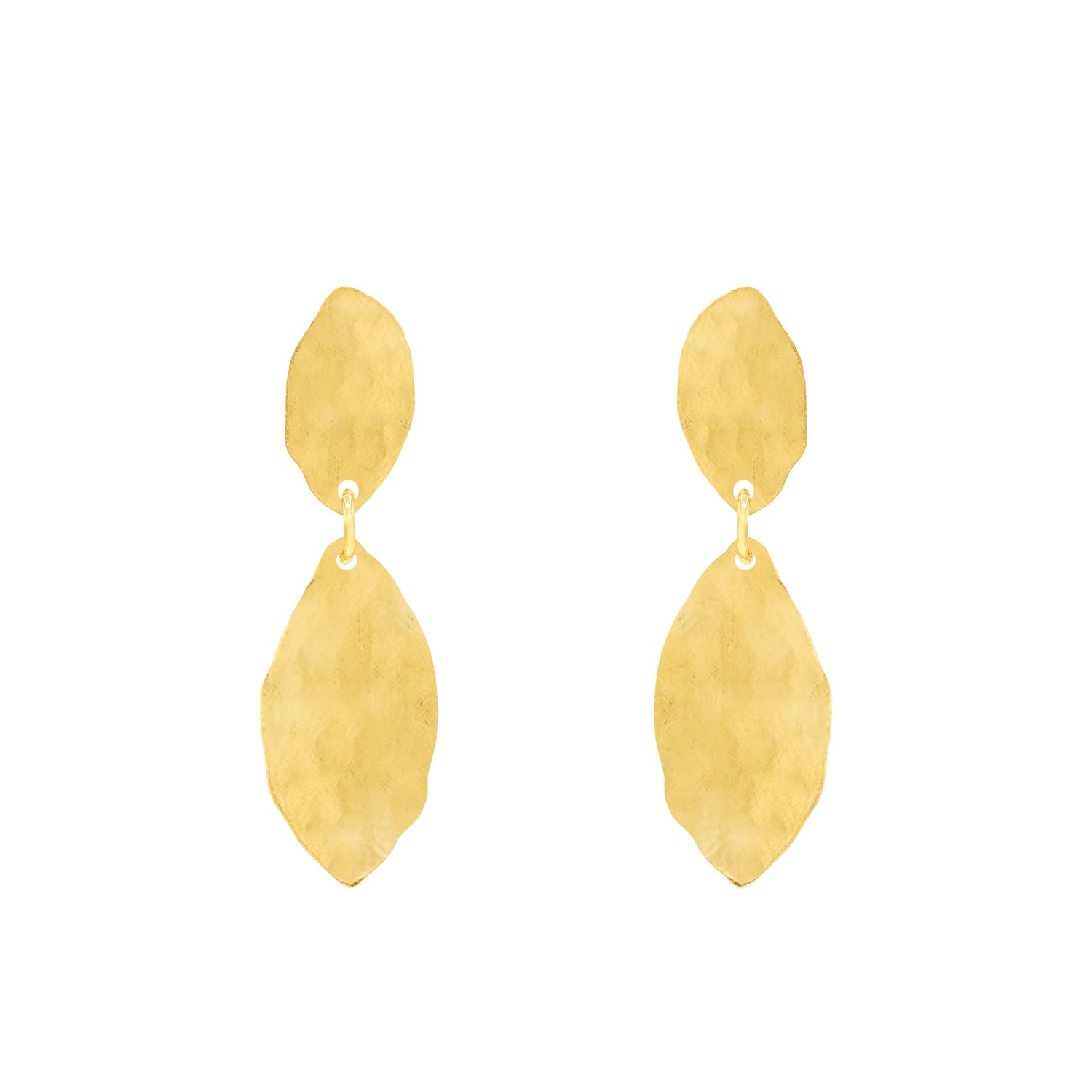 18k gold plated earrings made of two leaf shapes with a hammered texture. Measuring 1.5" long and Handmade in Brazil.