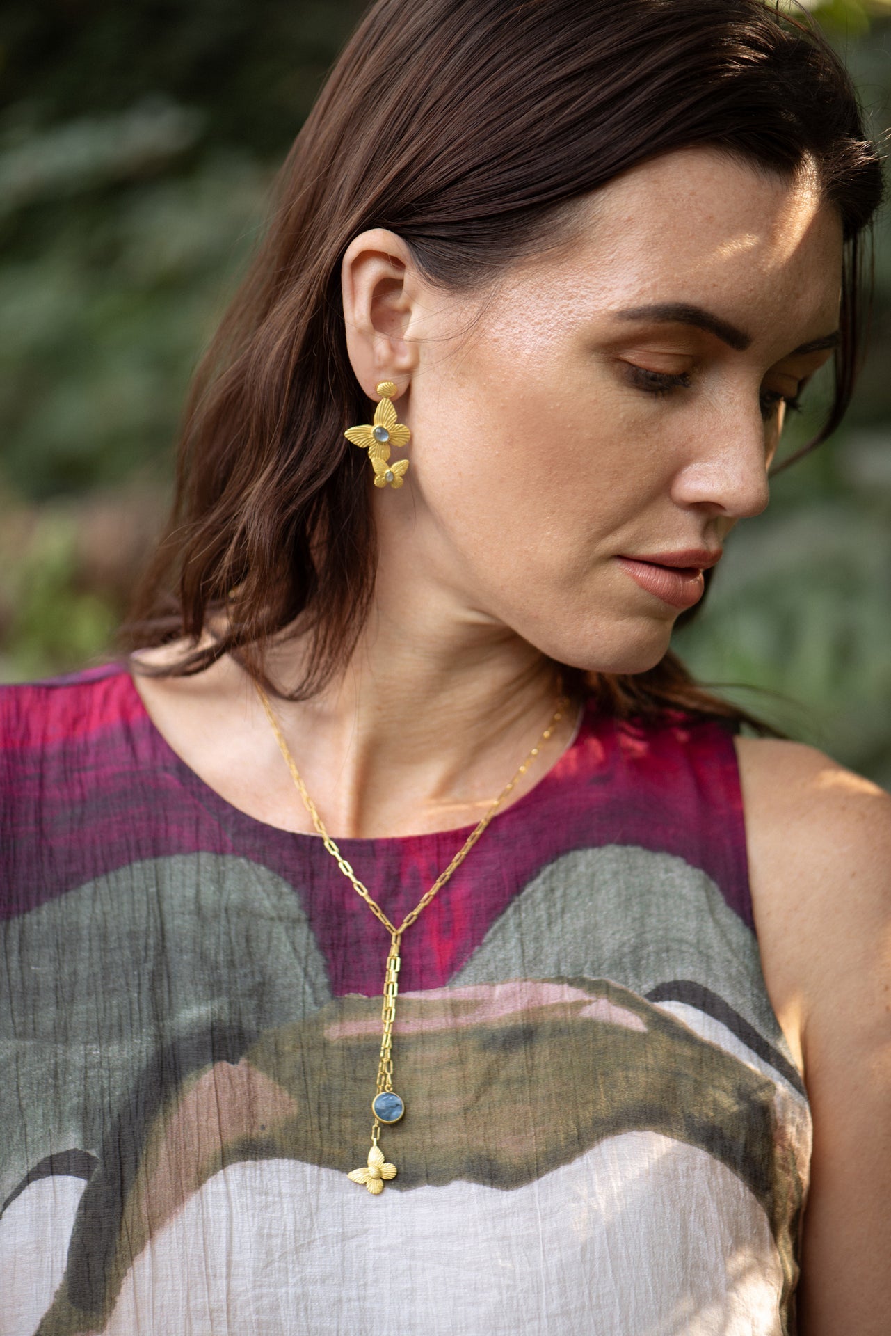 18k gold plated paperclip chain with a butterfly and stone pendant attached. Chain measures 18" with a 3" inch lariat with two charms attached at different lengths.
