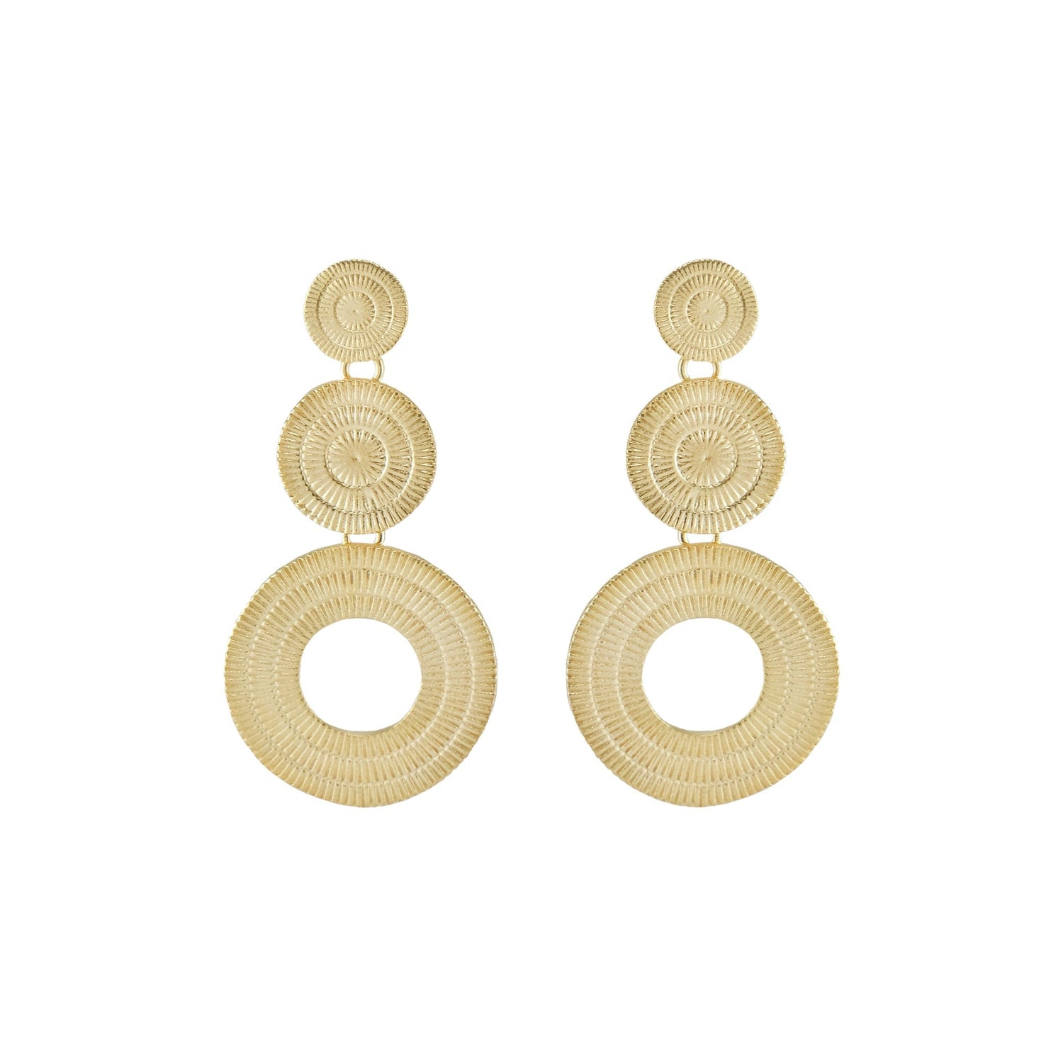 The Anat earrings feature a design with coins and open circle adorned with a distinctive sun-ray texture, plated in 18k gold. Measuring 2 inches in length, they add a refined and elegant touch to any outfit. Handmade in Brazil, these earrings showcase exceptional craftsmanship and artistic detail. They pair beautifully with the Dulce Necklace, creating a coordinated and stylish look.