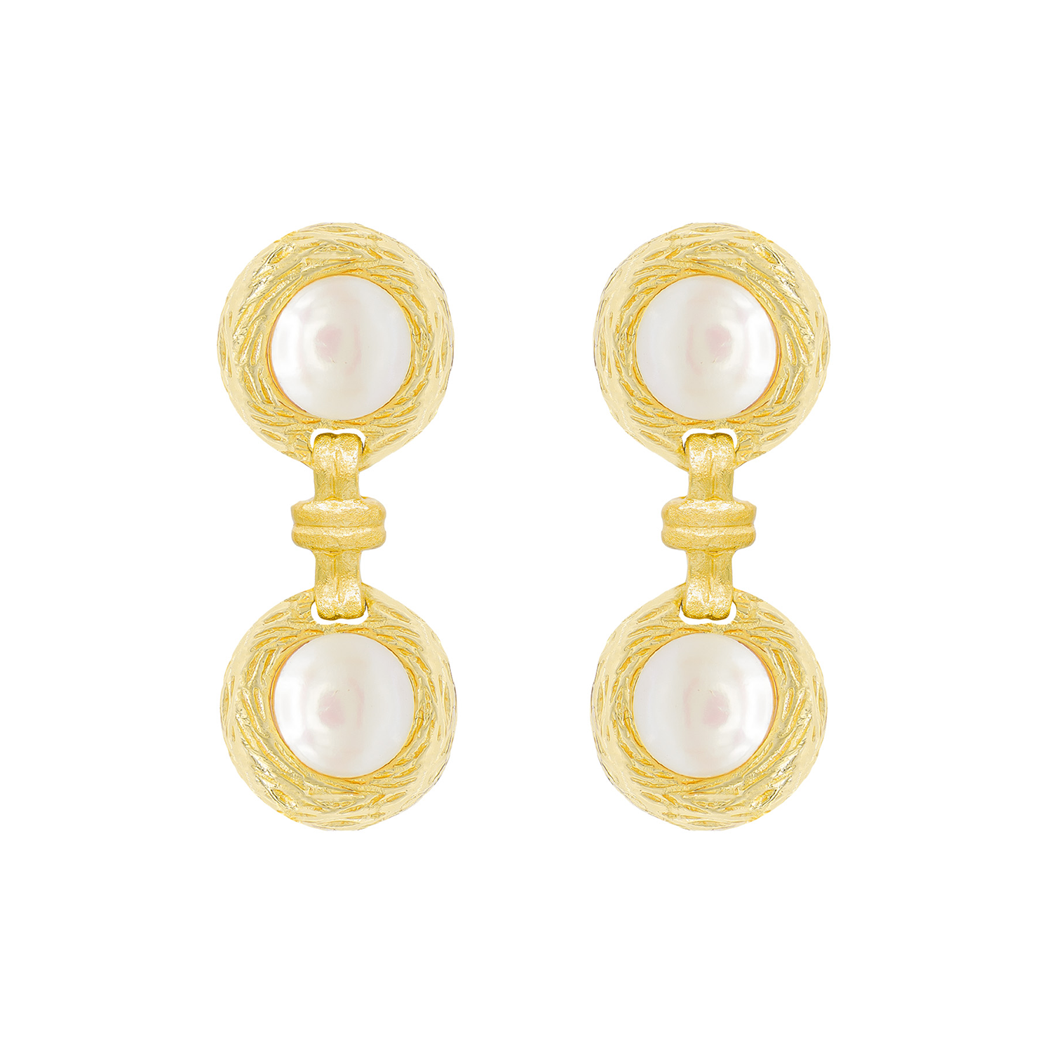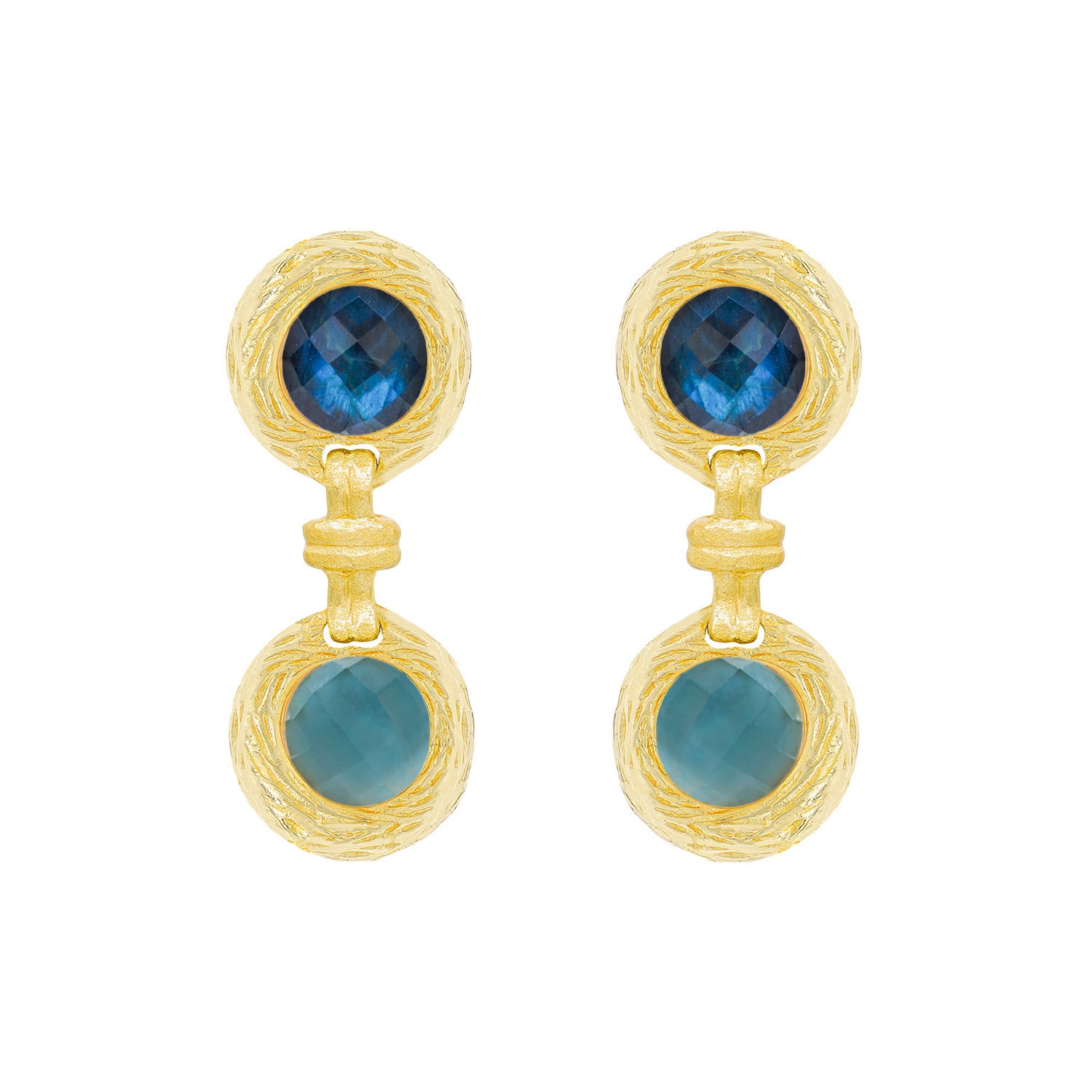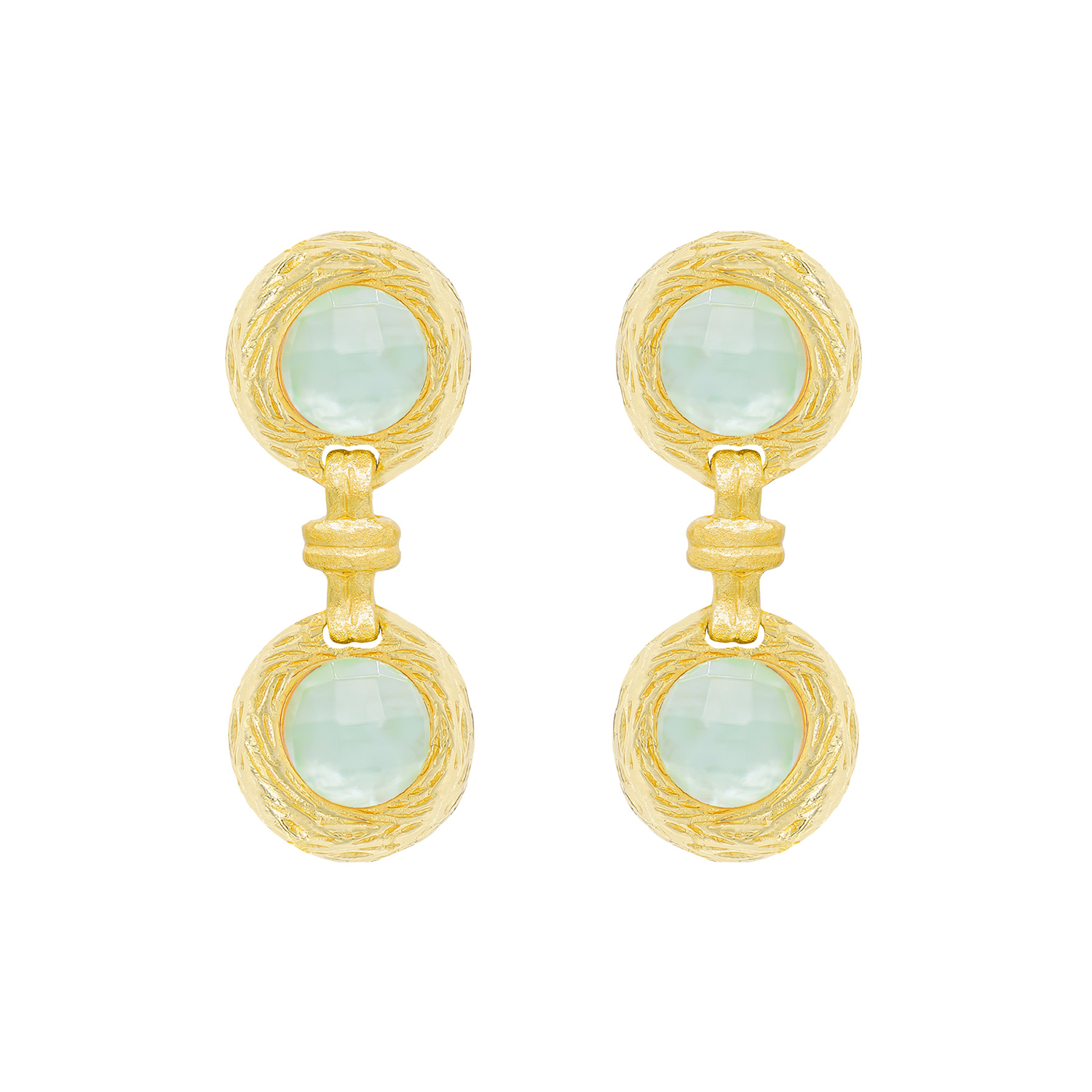 These earrings feature two round gemstones with a textured setting, connected by a knot detail. Crafted with 24k gold plating, they measure 1.5 inches. They pair beautifully with the Caspian bracelet, Bay necklace, and Kara ring.
