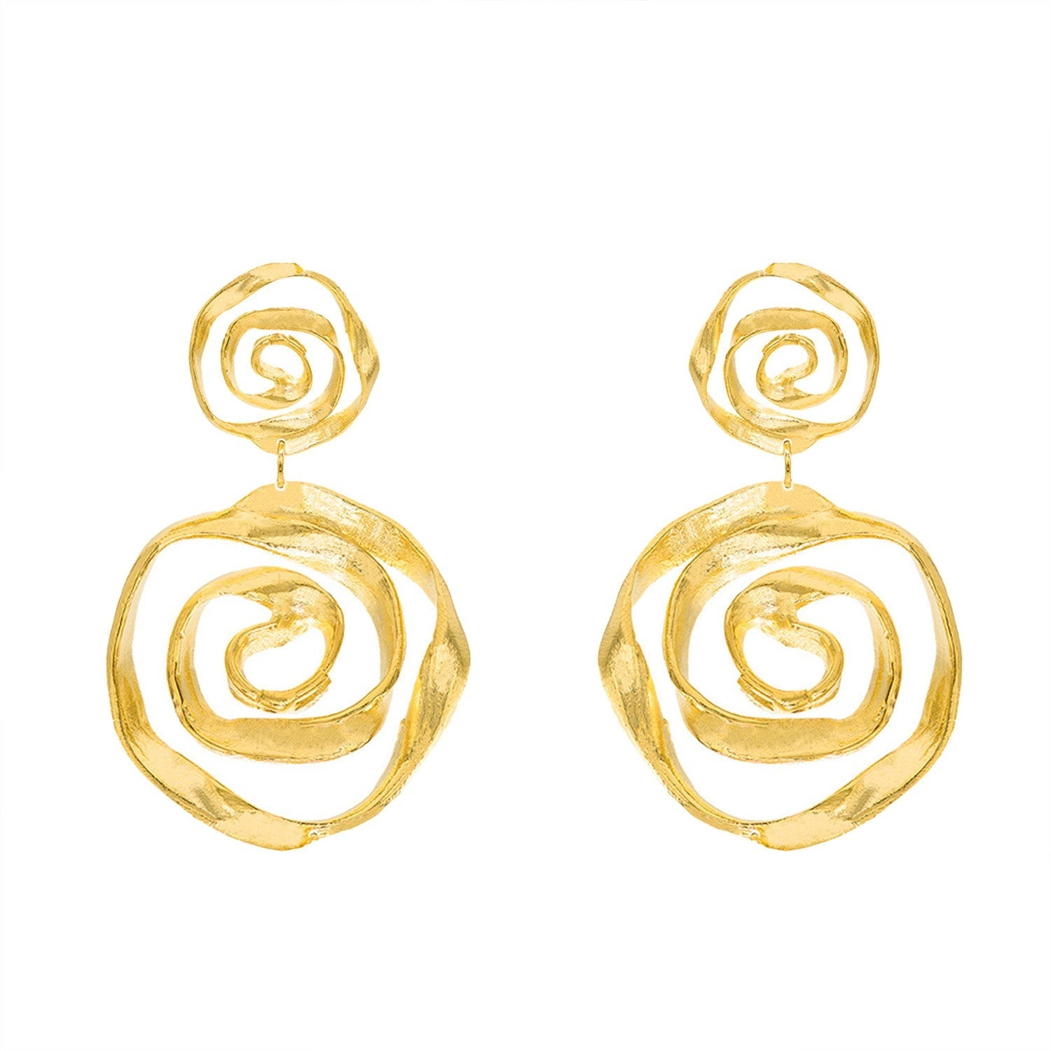 Elevate your style with these 18K gold-plated earrings featuring intricate attached swirl shapes, handcrafted with care in Brazil. These statement earrings measure 3 inches in length, making them the perfect balance of bold and graceful.