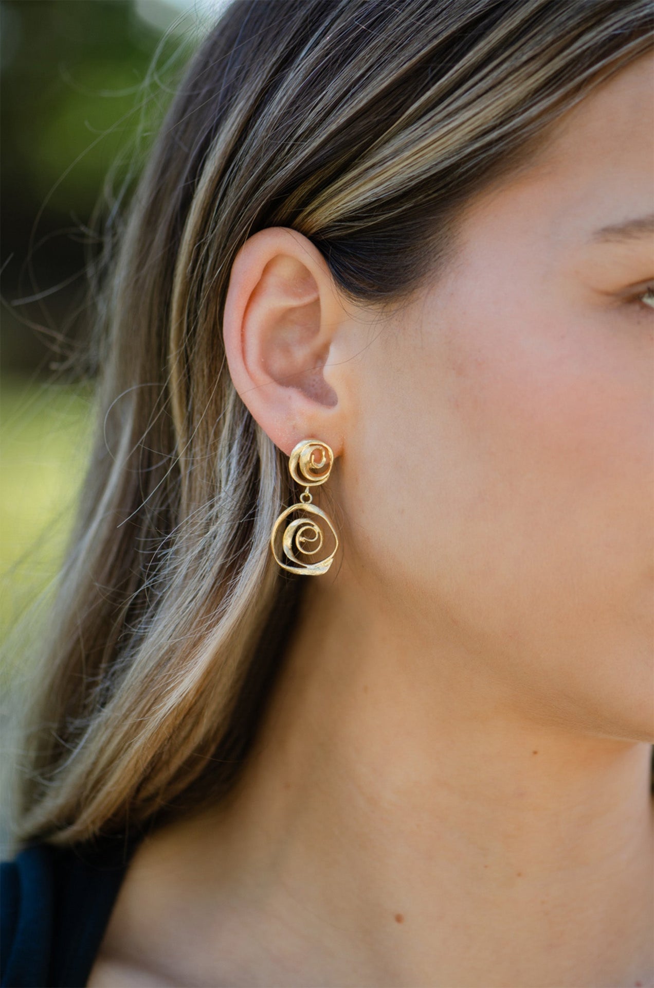 Elevate your style with these 18K gold-plated earrings featuring intricate attached swirl shapes, handcrafted with care in Brazil. These statement earrings measure 3 inches in length, making them the perfect balance of bold and graceful.