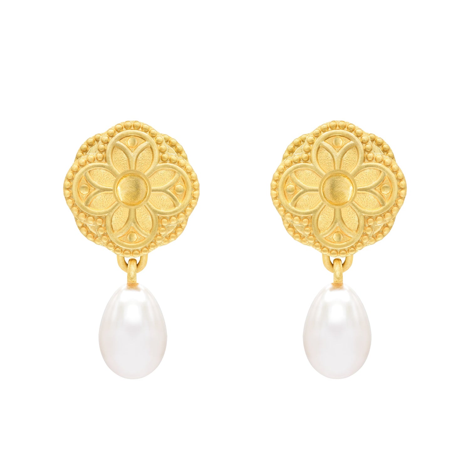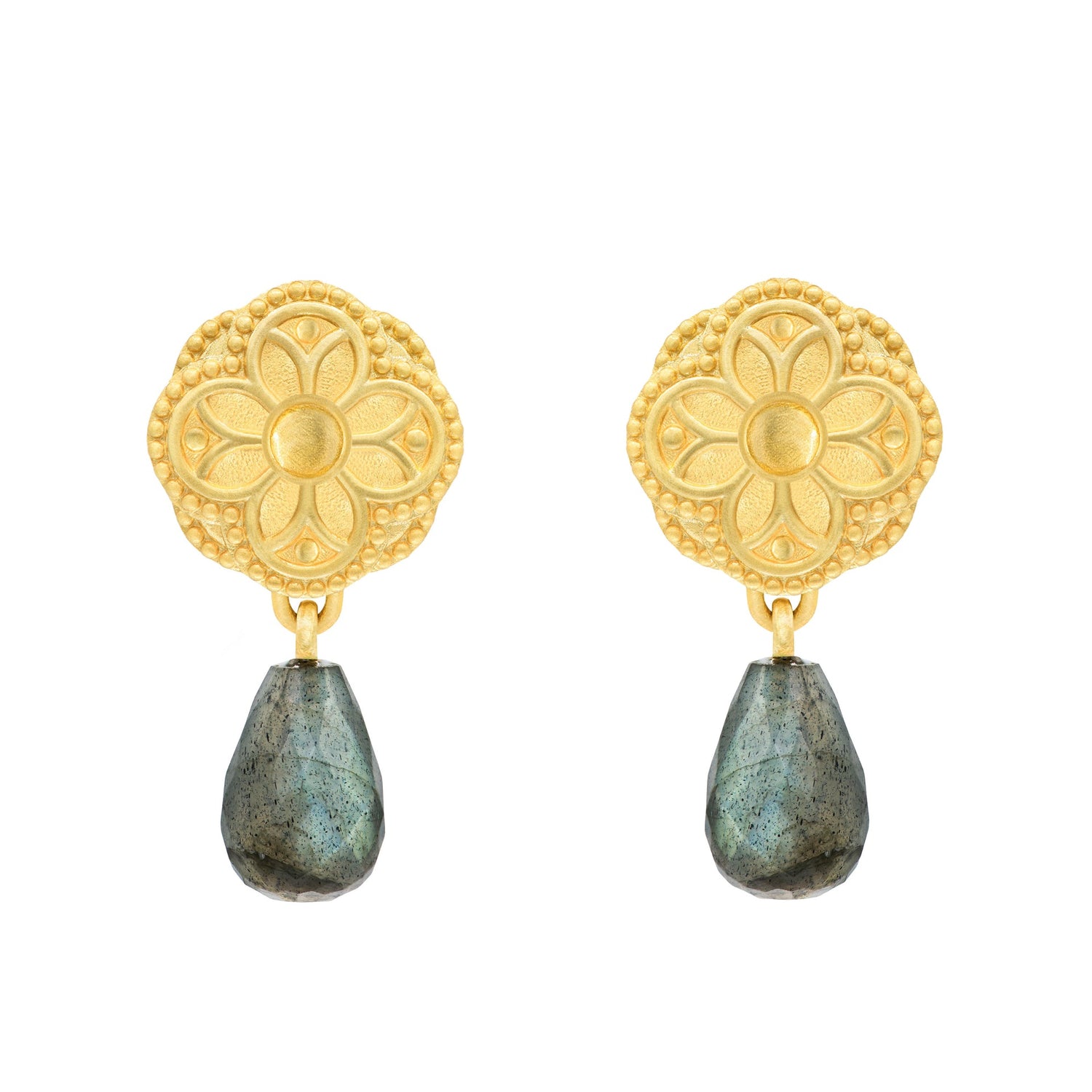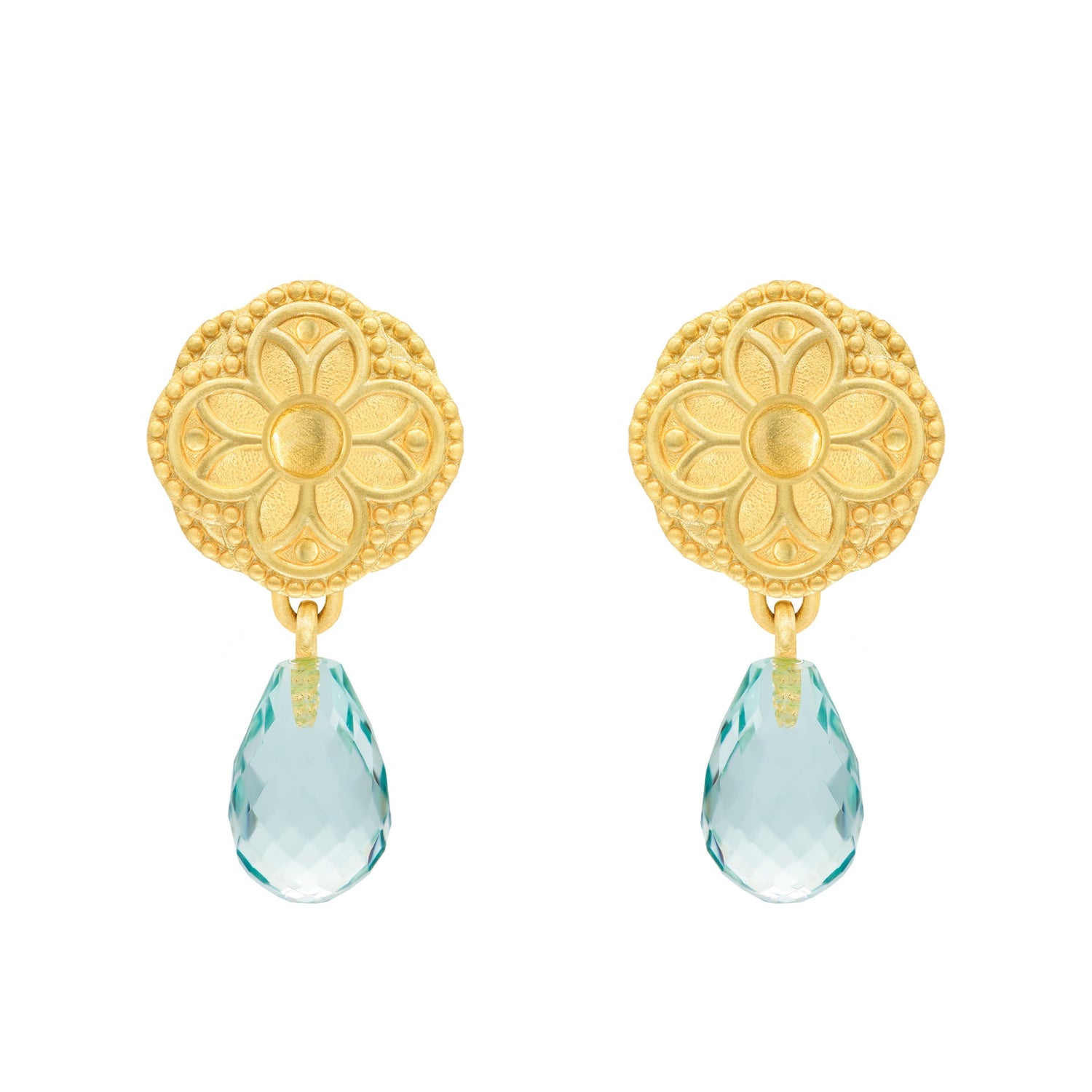 18k gold plated flower stud earrings with a gemstone droplet attached to the bottom. Measures 1" long.