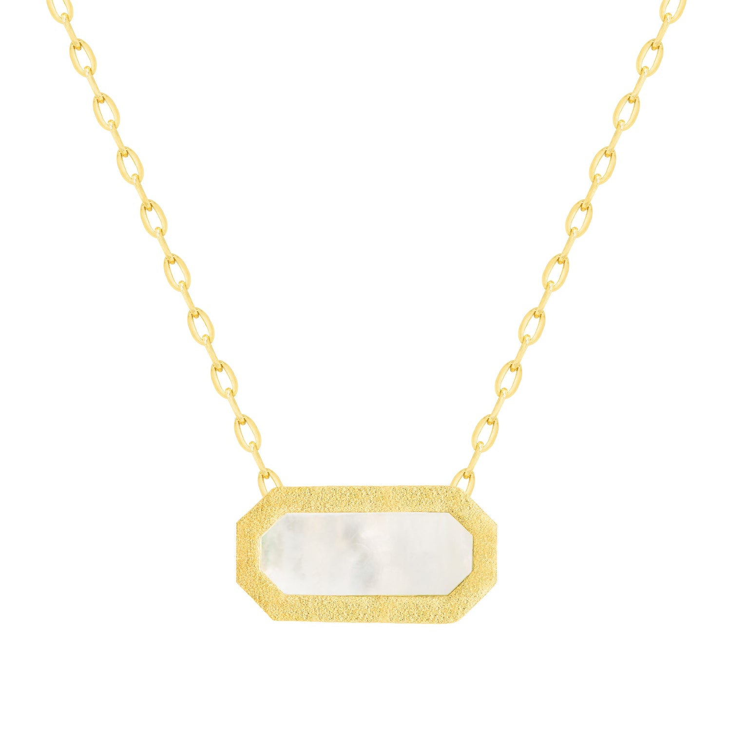 18k gold plated necklace with an elongated stone octagon charm attached. The chain measures 19" with a 2" extender and charm measures 1" long