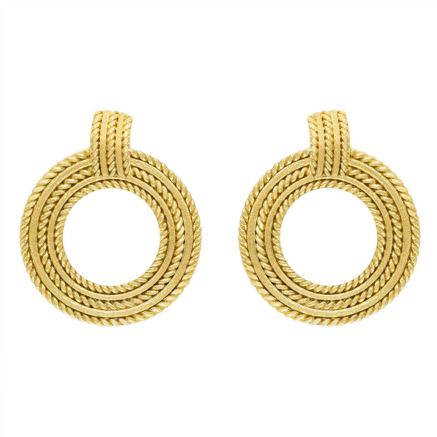 18k gold plated rope textured earrings with open circle attached to stud Measures 1"