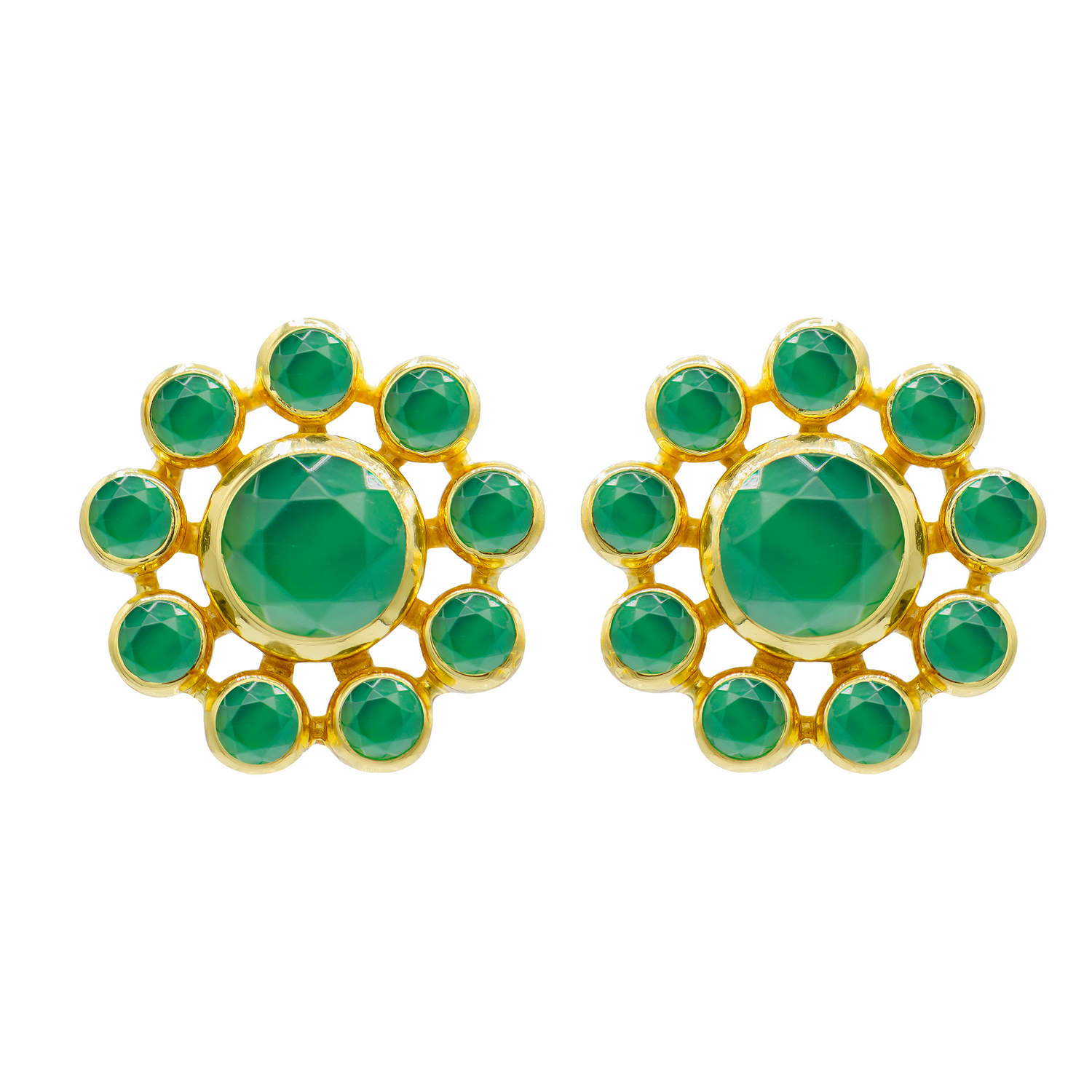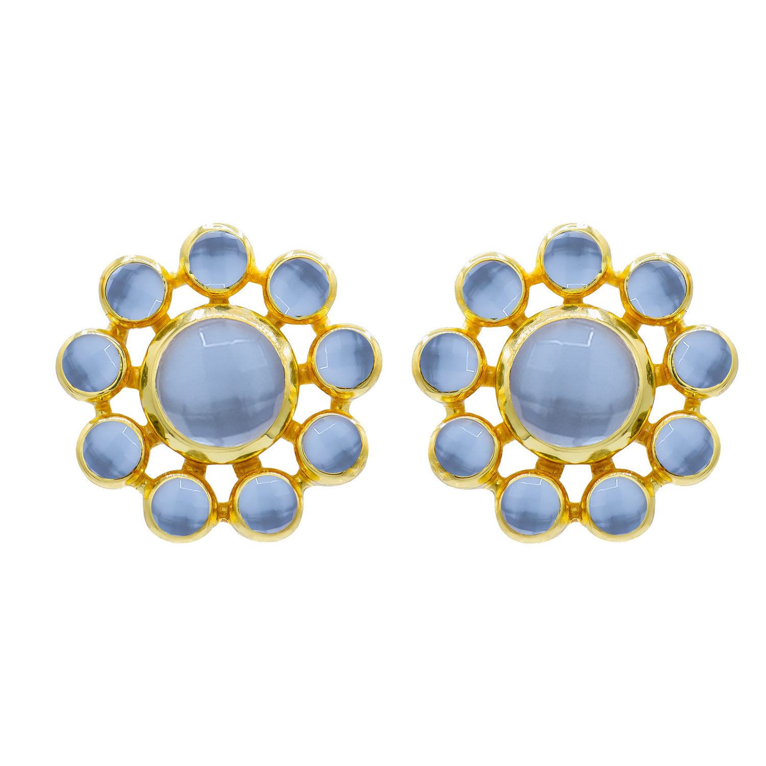 These 18k gold plated flower stone stud earrings measure 0.5 inches and are available in Tanzanite, Labradorite, Green Onyx, Rose Quartz, and Pearl. They pair beautifully with the Ambrosia Necklace, Daisy necklace and Arden ring.