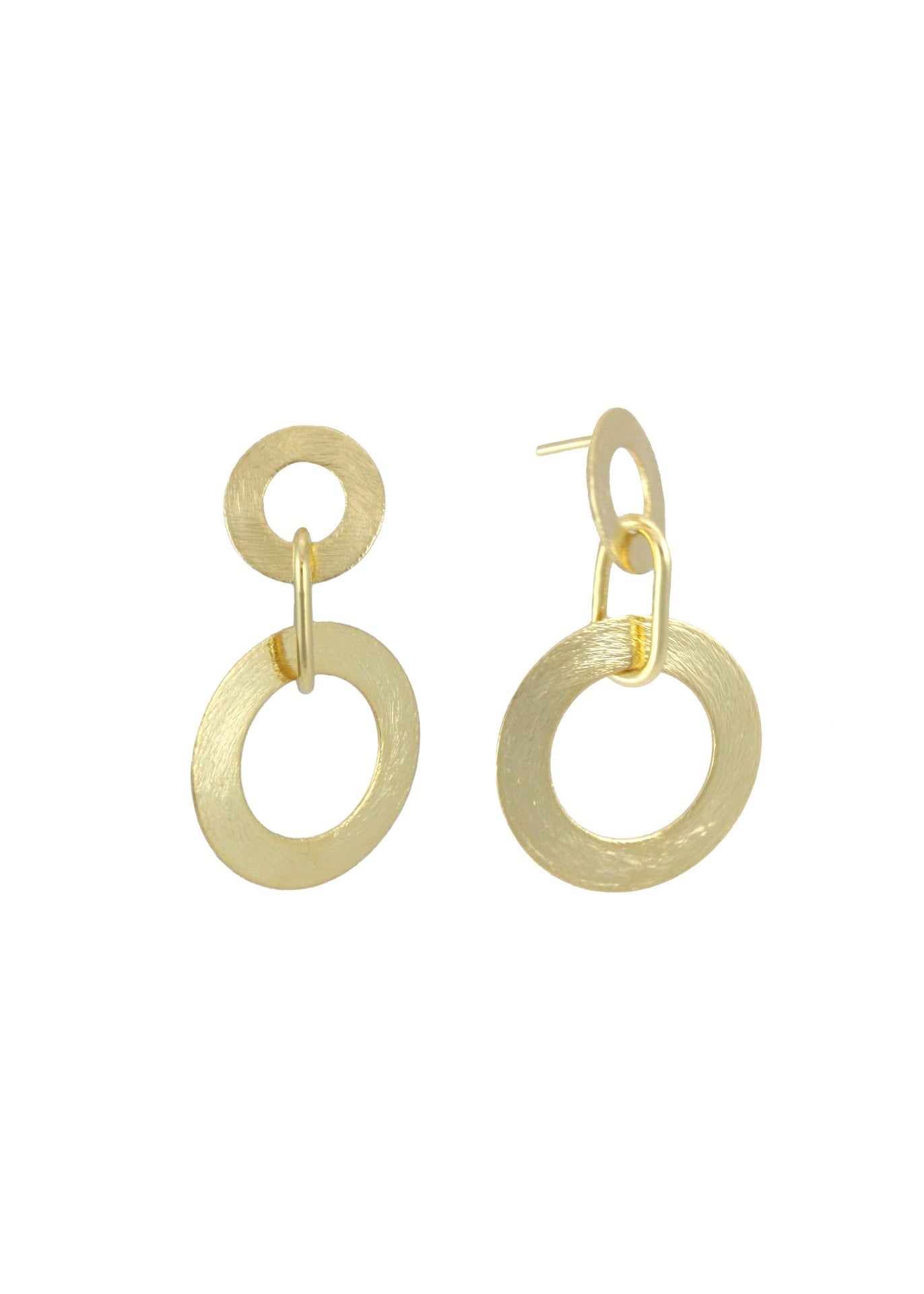 These double circle post earrings are 18k gold plated and handmade in Brazil. Featuring two interconnected circles, they offer a sleek and elegant look, perfect for everyday wear or special occasions. Measures 1 1/4" long