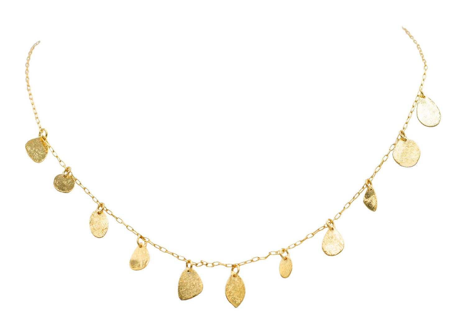 18k gold plated necklace featuring multiple shaped charms attached along the chain. Measures 16 inches with a 2-inch extender.