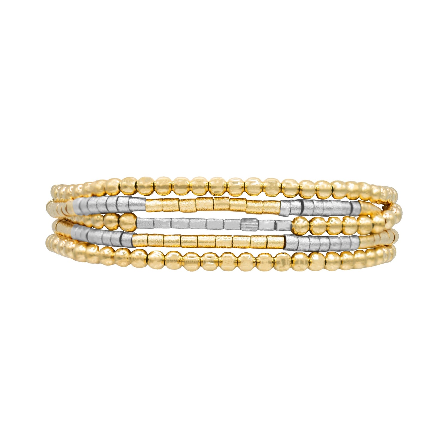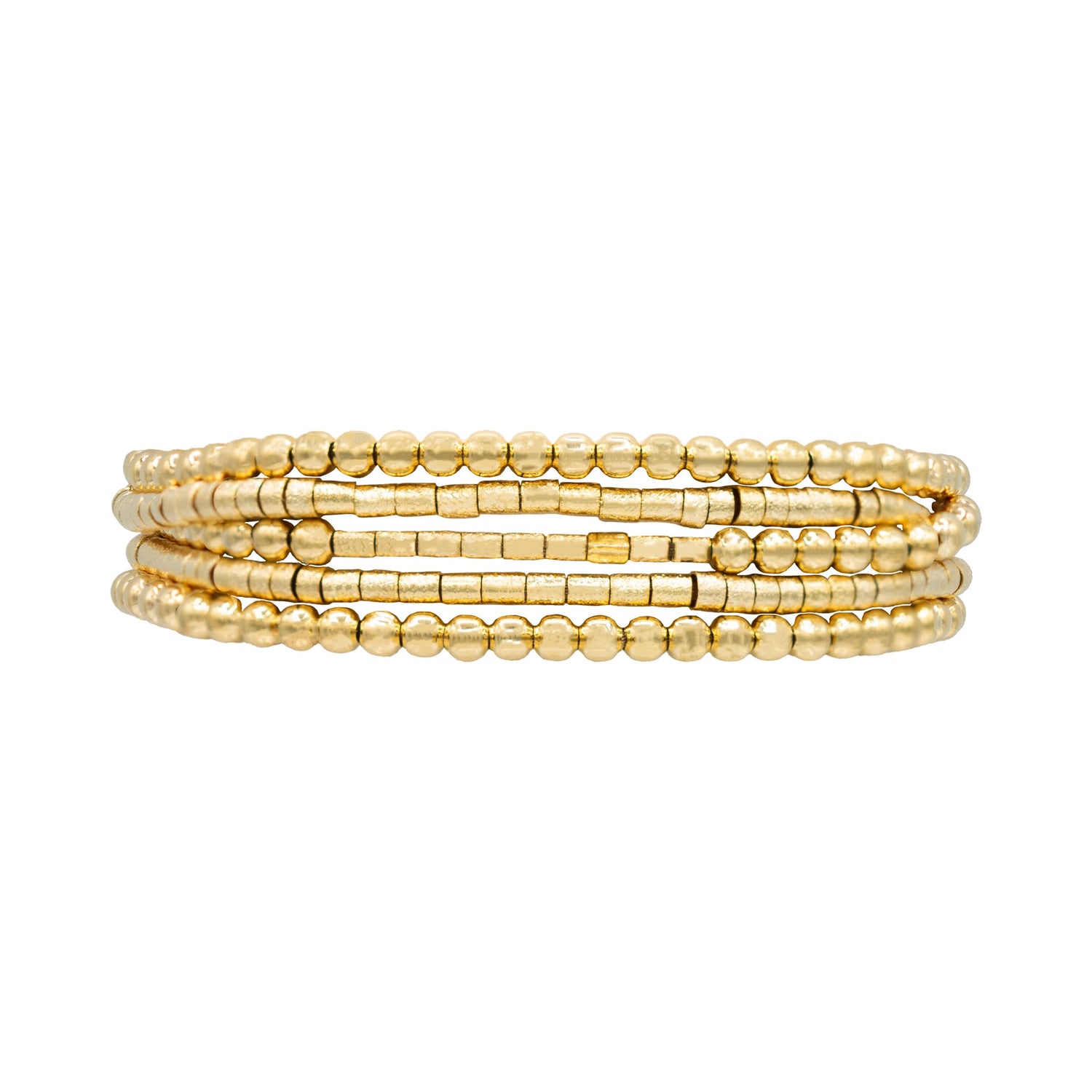 Elegant and versatile, this 18k gold plated bracelet features 5 strands of a mix of smooth round, square, and ball-shaped beads strung together in delicate look. Finished with a secure magnetic closure, it’s handmade in Brazil and designed for effortless style and easy wear.
