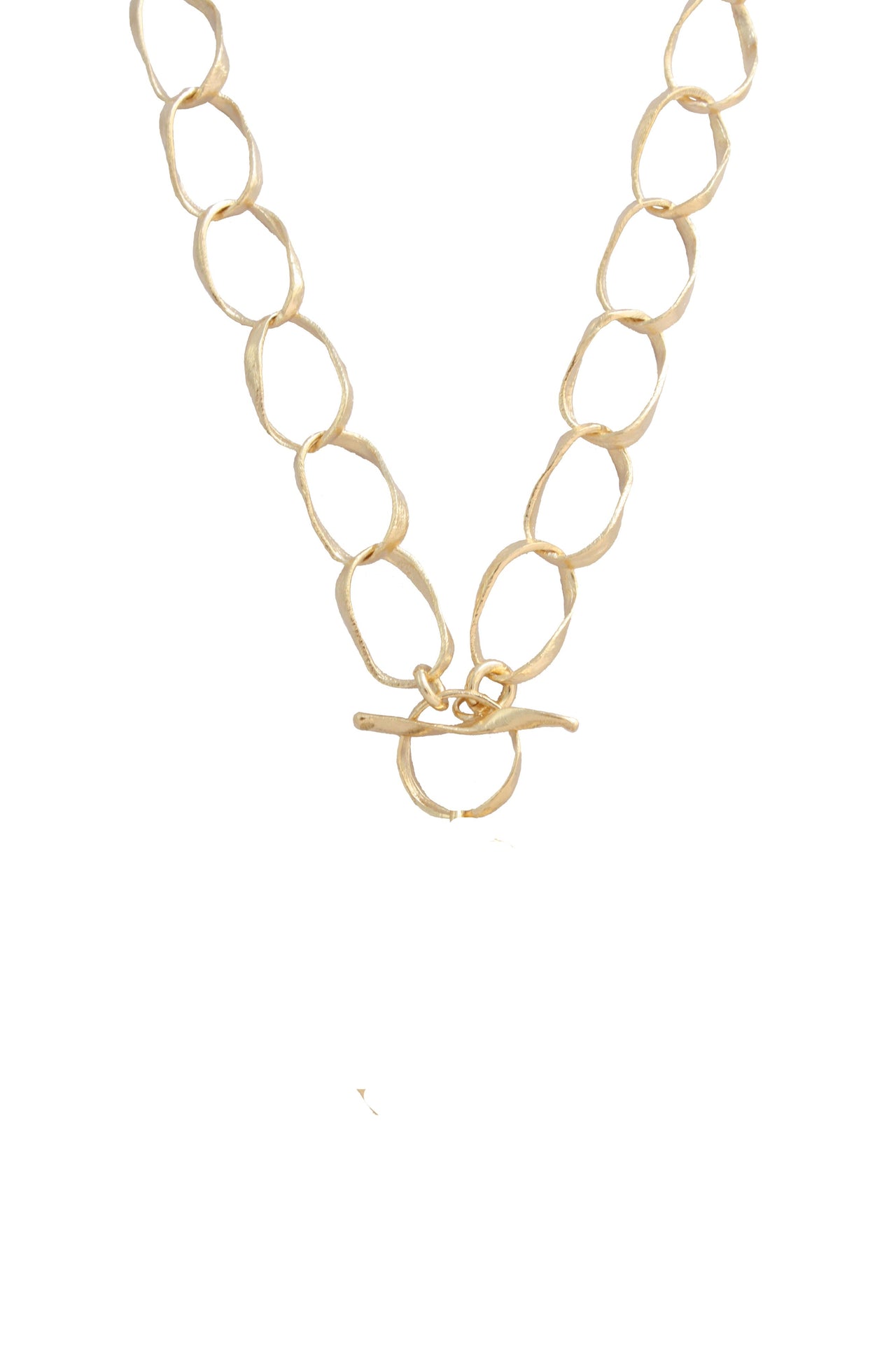 18k gold plated interlocking twist chain necklace with front toggle clasp. Measures 18" and handmade in Brazil.
