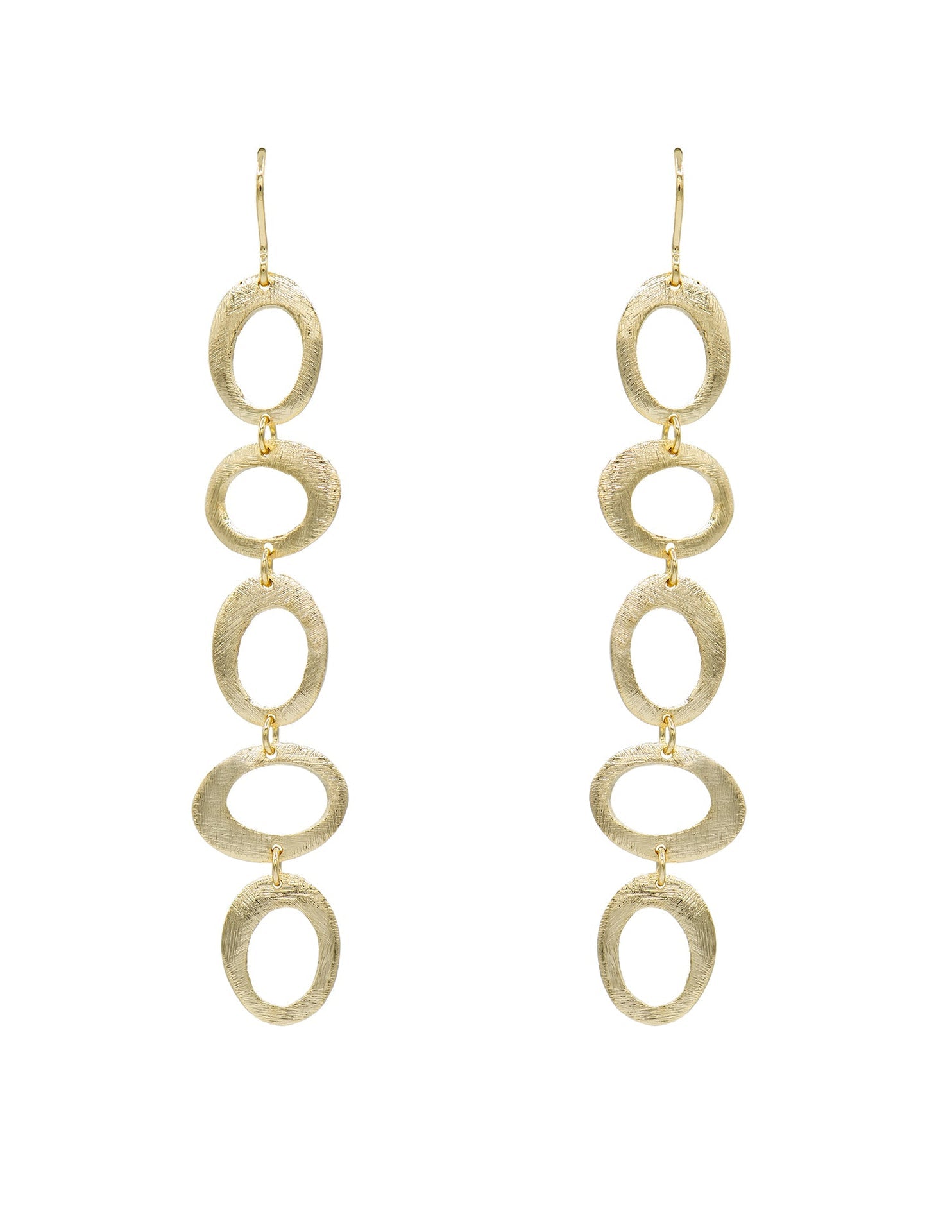 -18k gold plated hanging earrings with 5 open circle shapes.