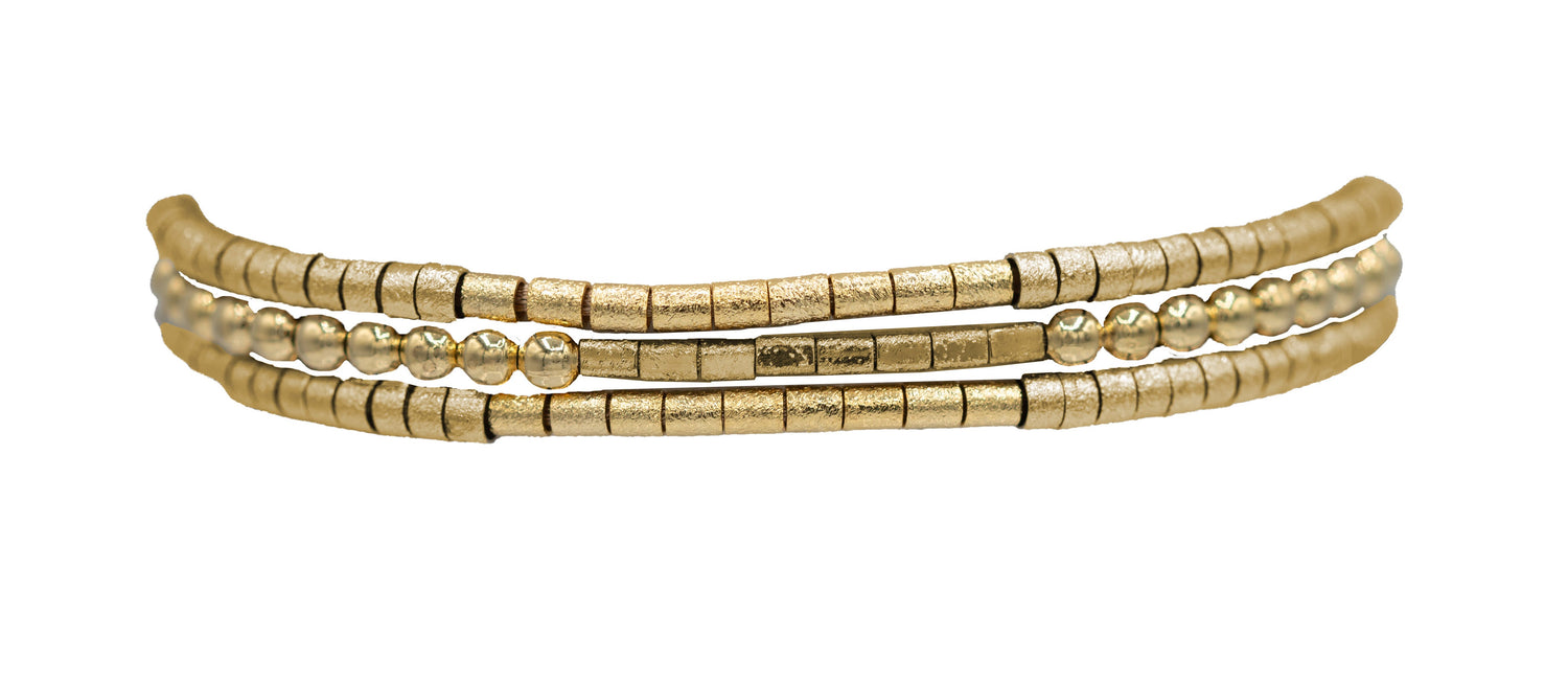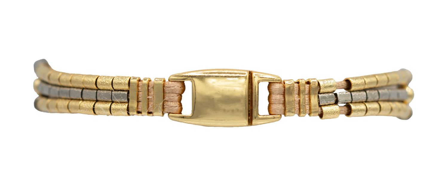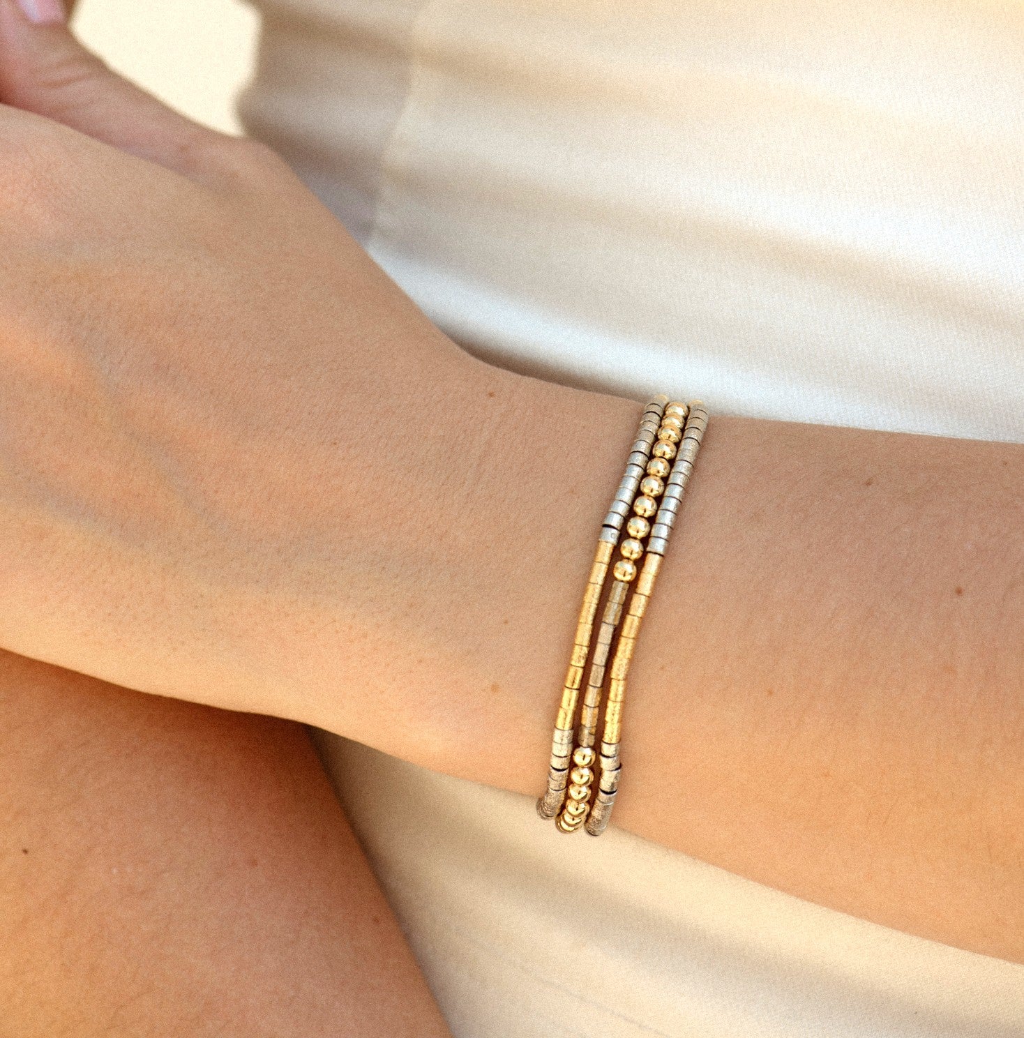 18k gold plated and rhodium plated bracelet featuring three rows of polished balls and metal beads, finished with a magnetic clasp. Measures 7 inches. Delicate yet statement-making. Handmade in Brazil.