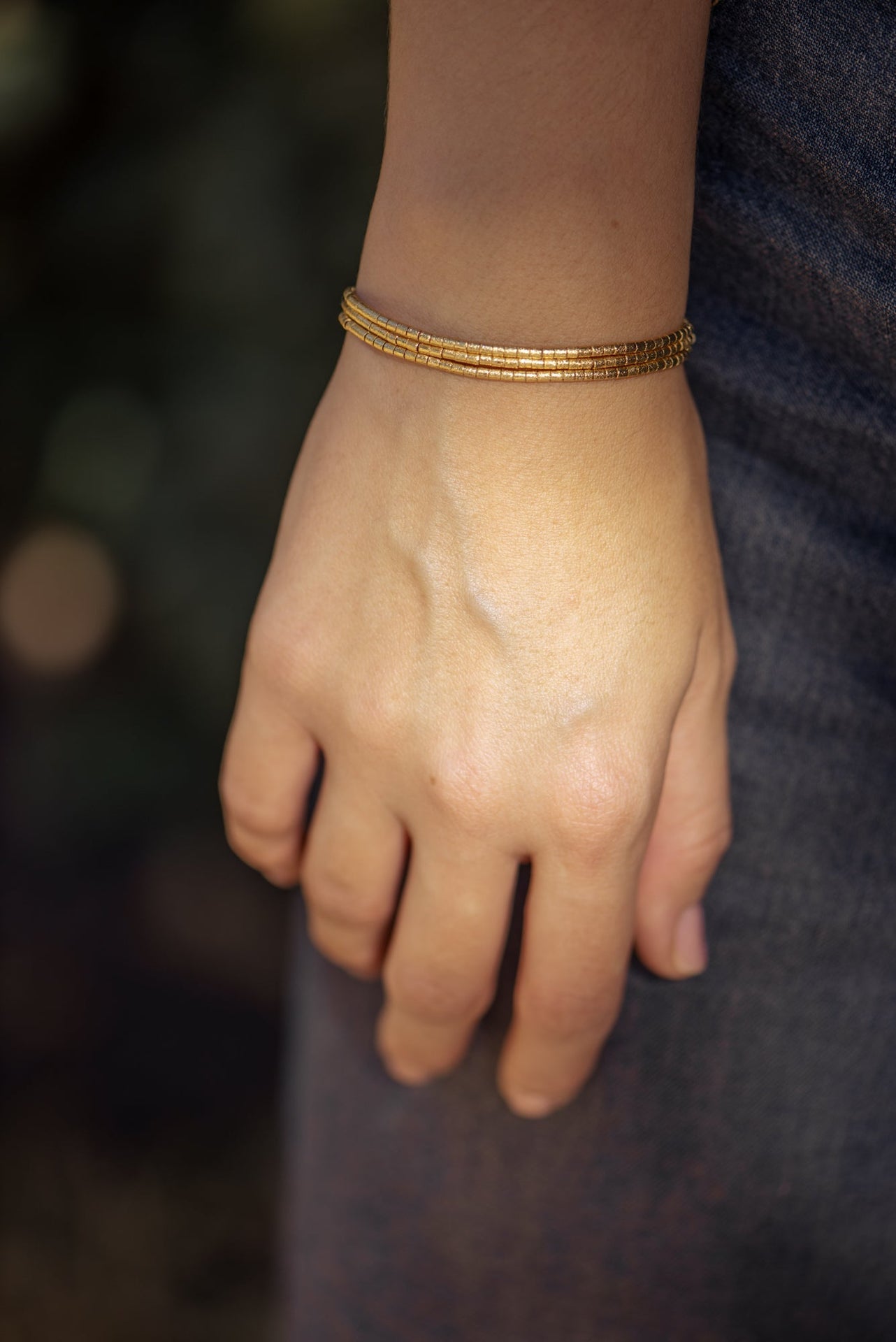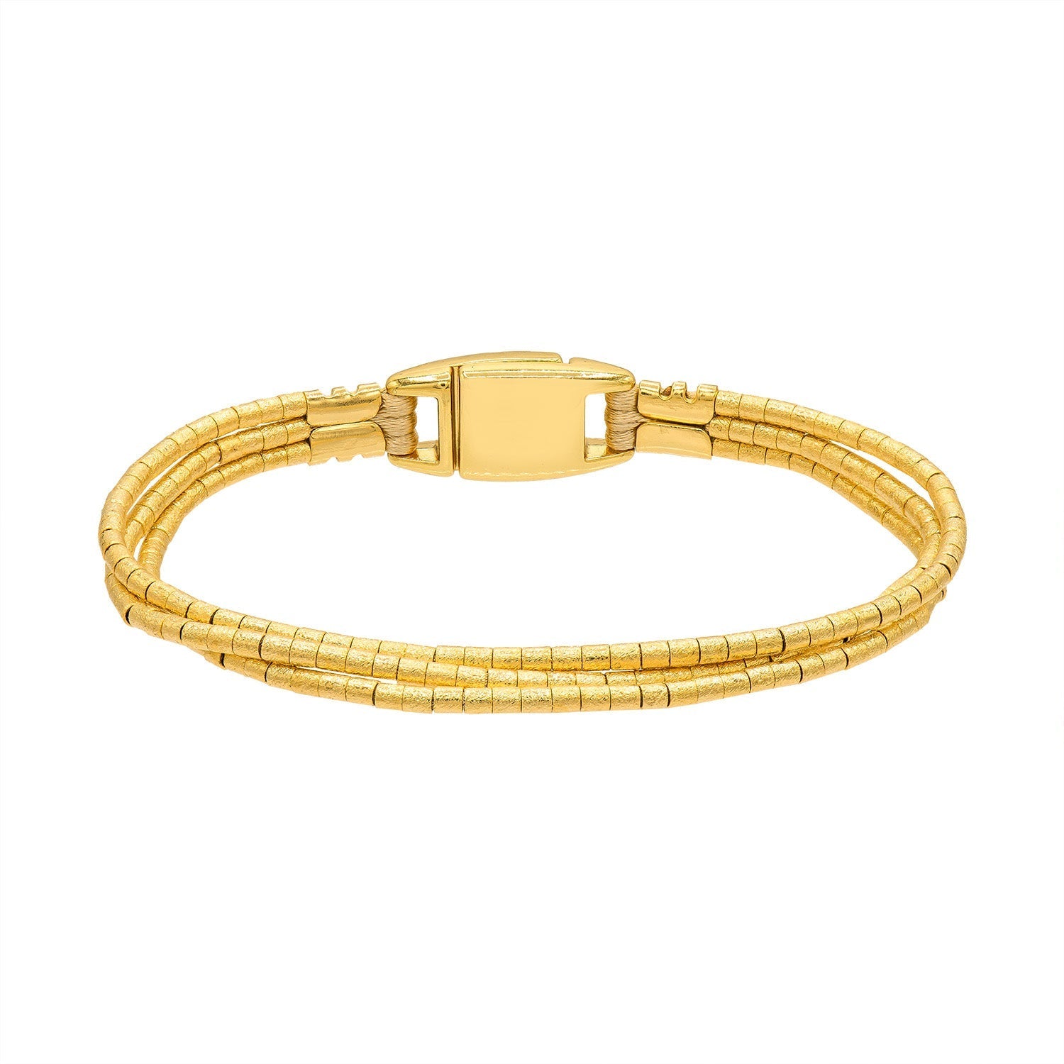 18k gold plated 3-strand bracelet made of small cylinder beads attached with a magnetic closure.
