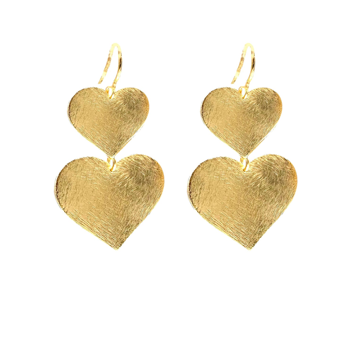 18k gold plated double heart earrings with a brushed wire finish. Measuring 1.5 inches long, these handmade earrings from Brazil offer a delicate and romantic touch to any look.