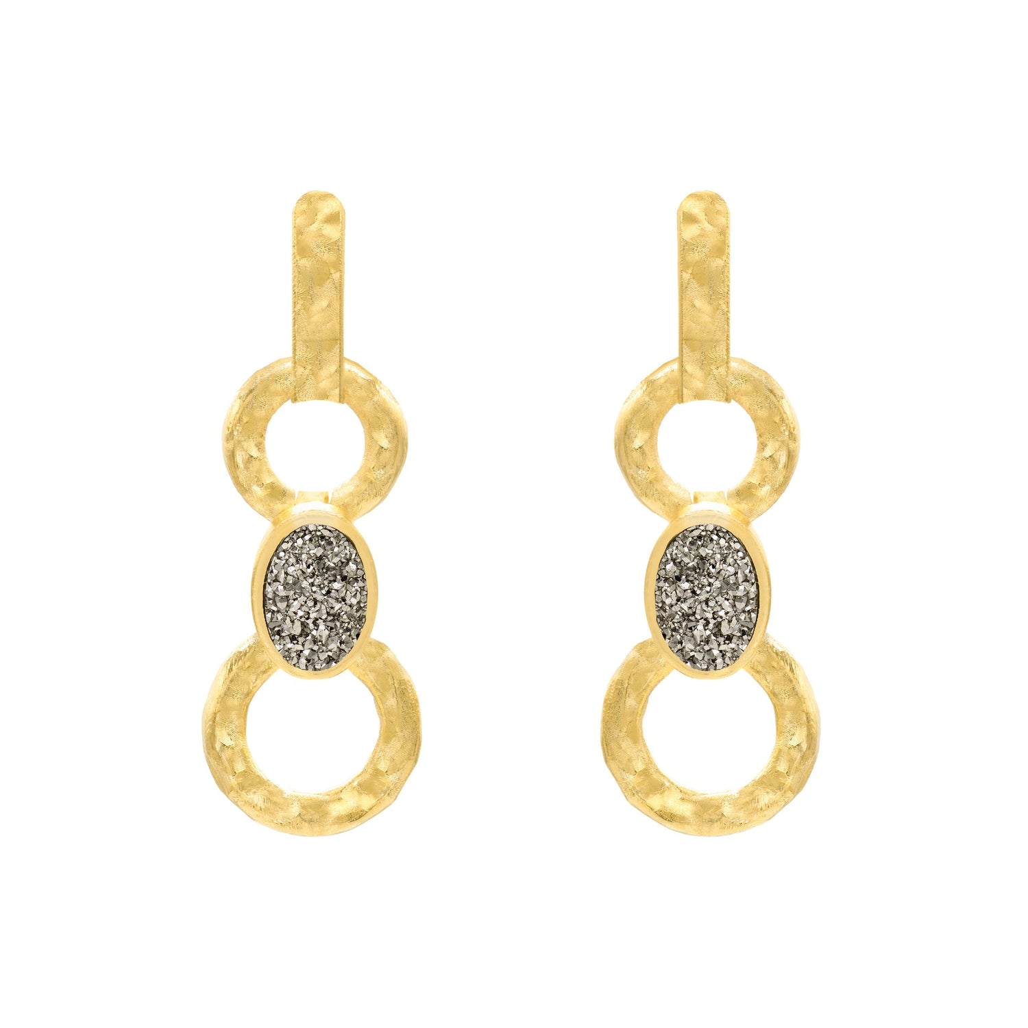 18k gold plated earrings of two circles connected with an oval titanium druzy stone. Measures 2" Long.