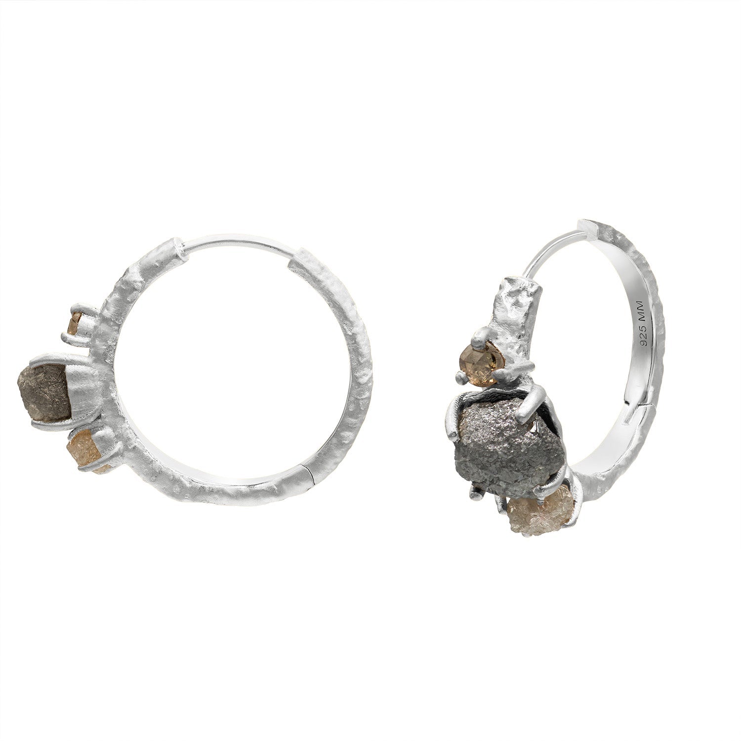 24k gold plated hammered textured hoops over sterling silver with three rough diamonds in varying sizes.