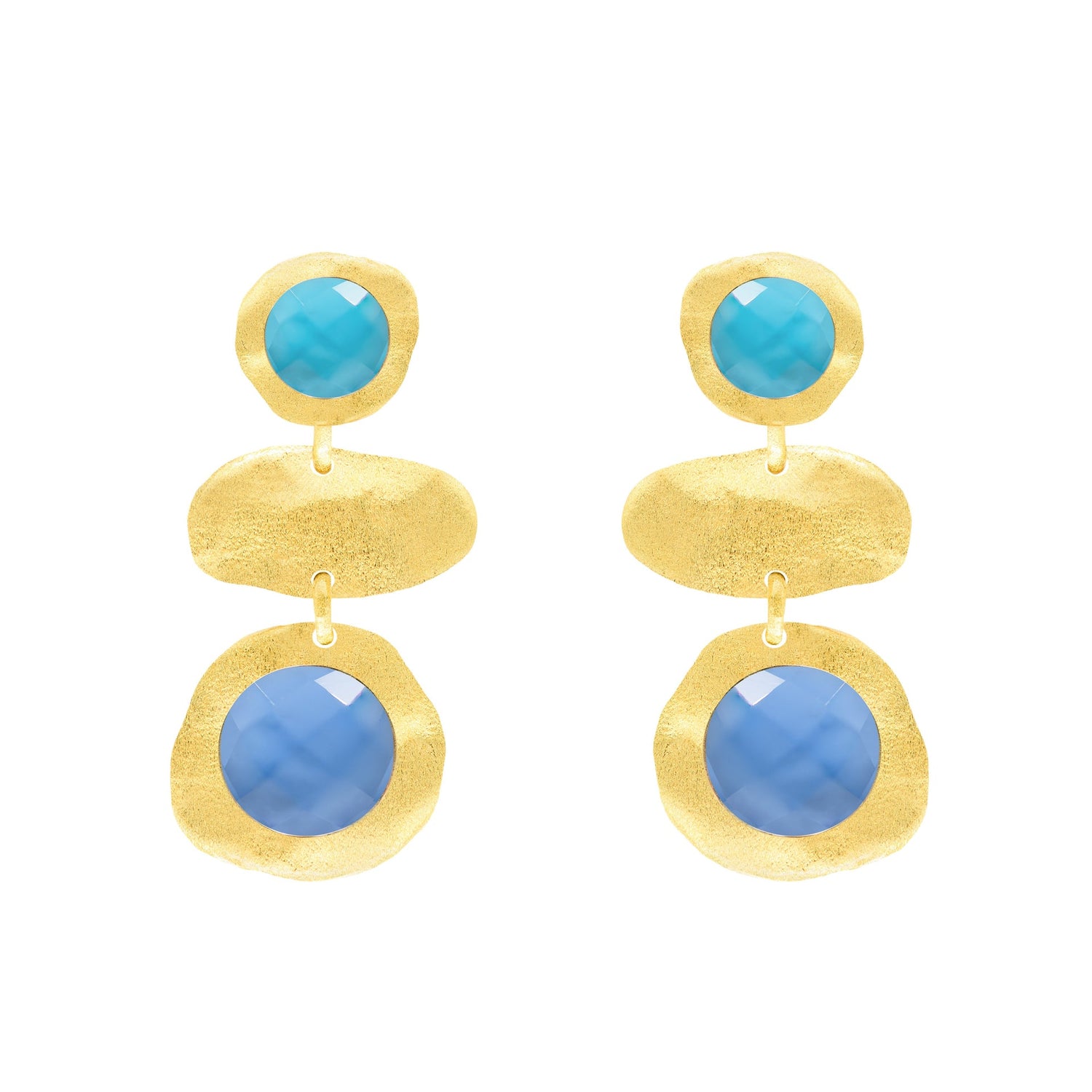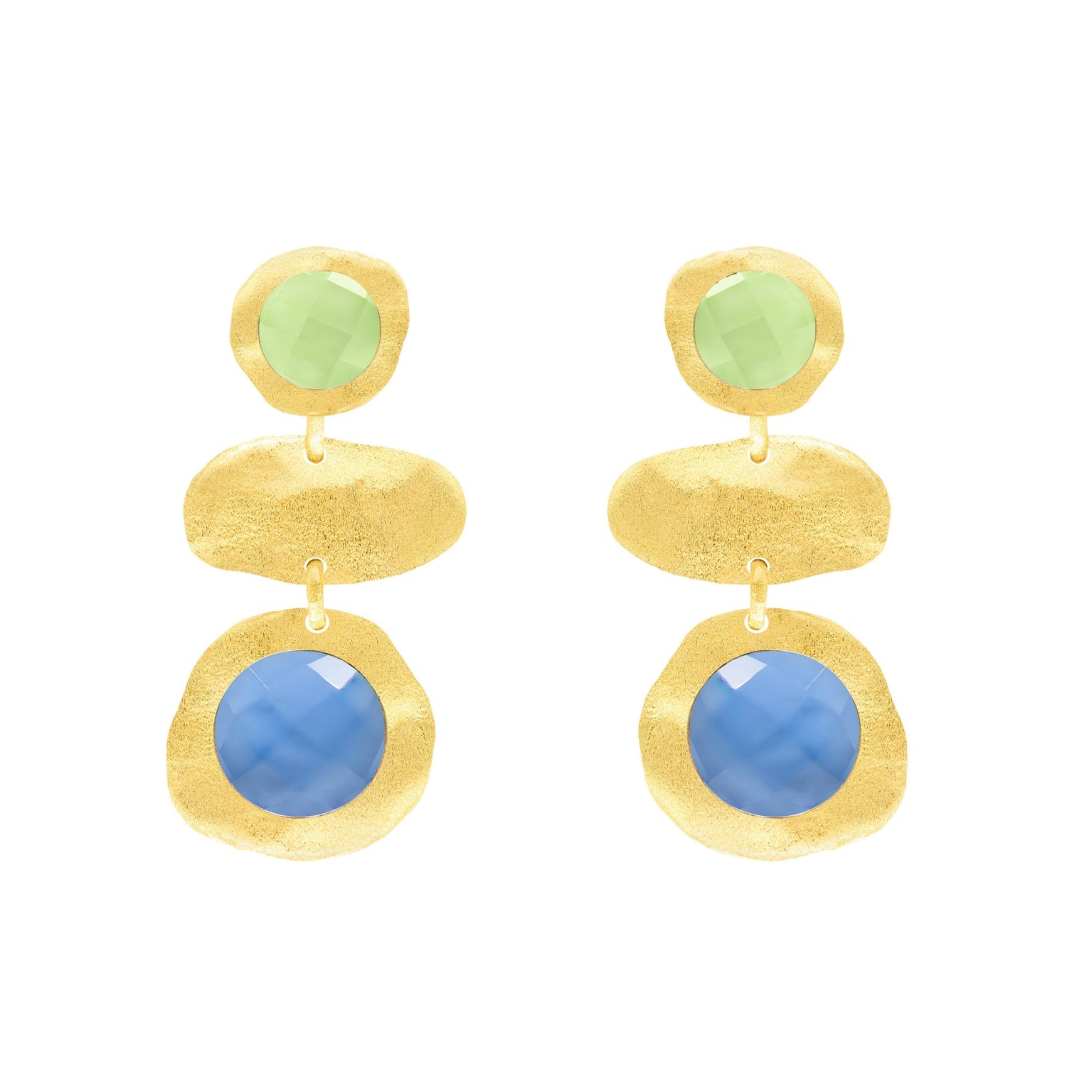 18k gold plated earrings made of organic shapes with stones on the top and bottom. Measures 1.25" long
